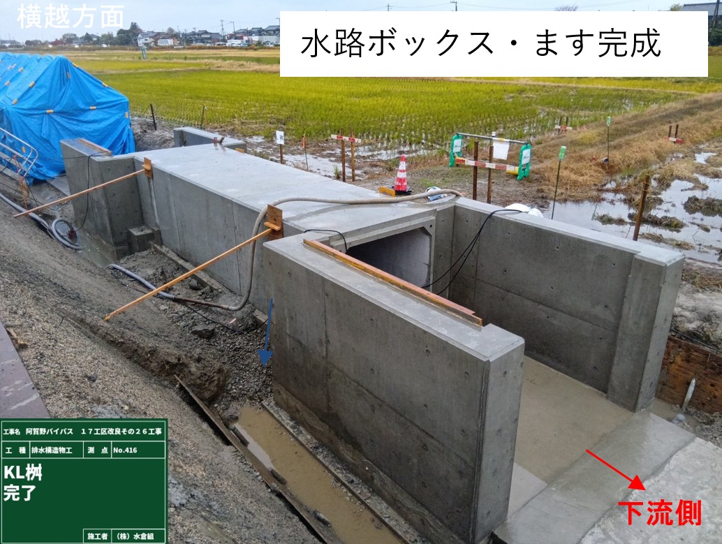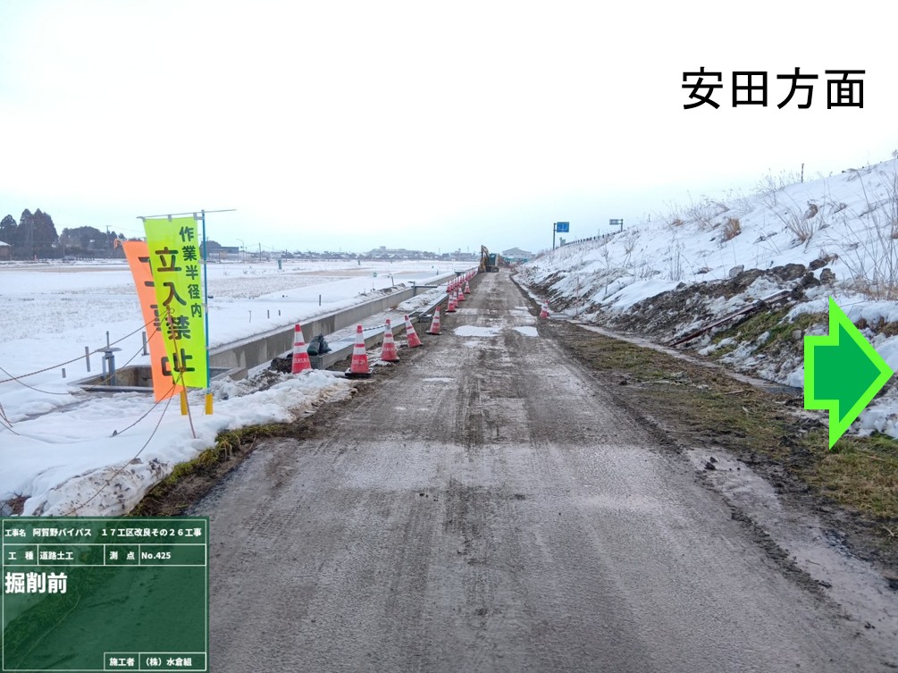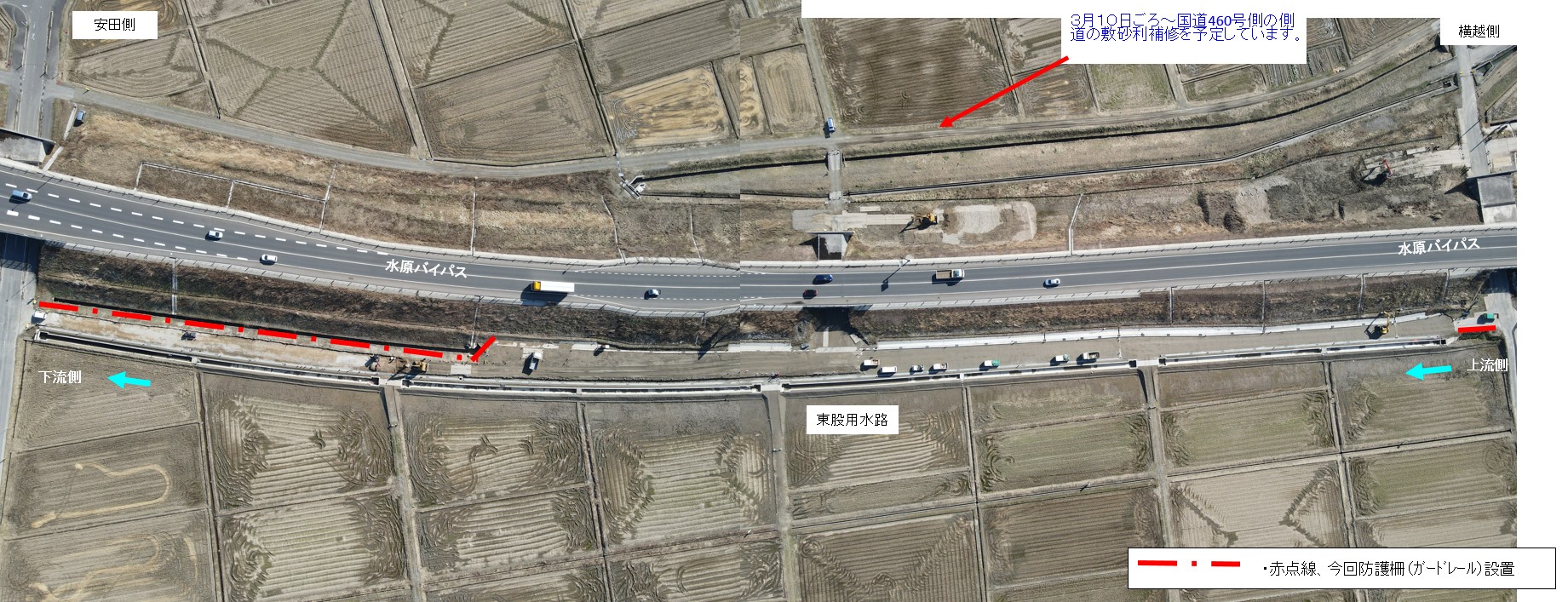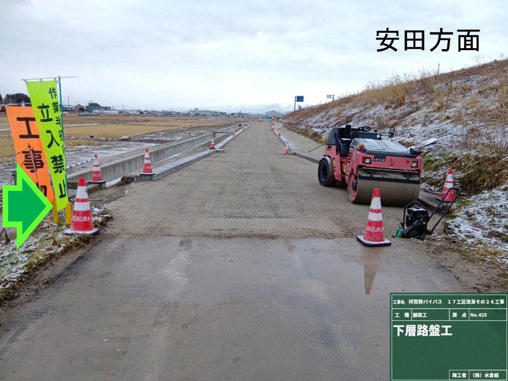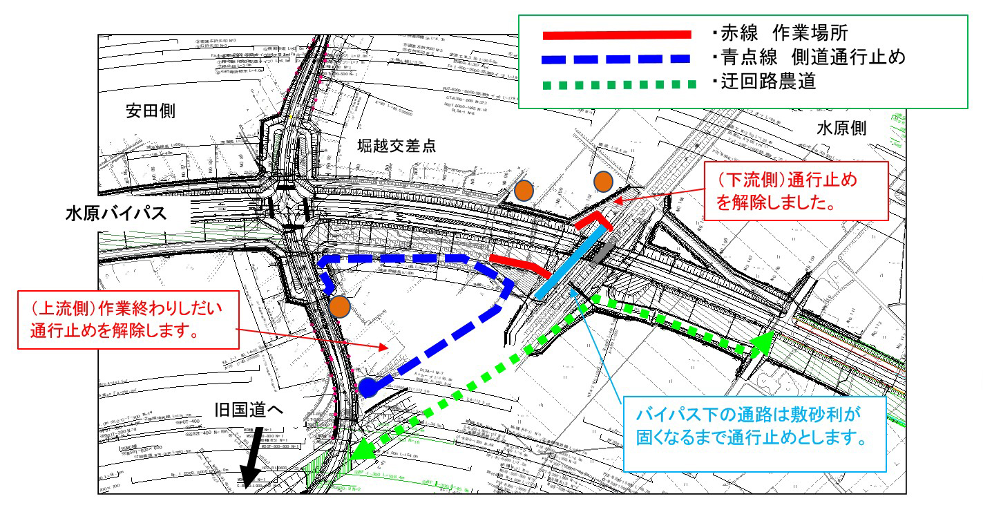 ・バイパス下の通路(管理用通路)については、敷砂利が固くなるまで通行止めとします。農道の迂回にご協力お願いします。