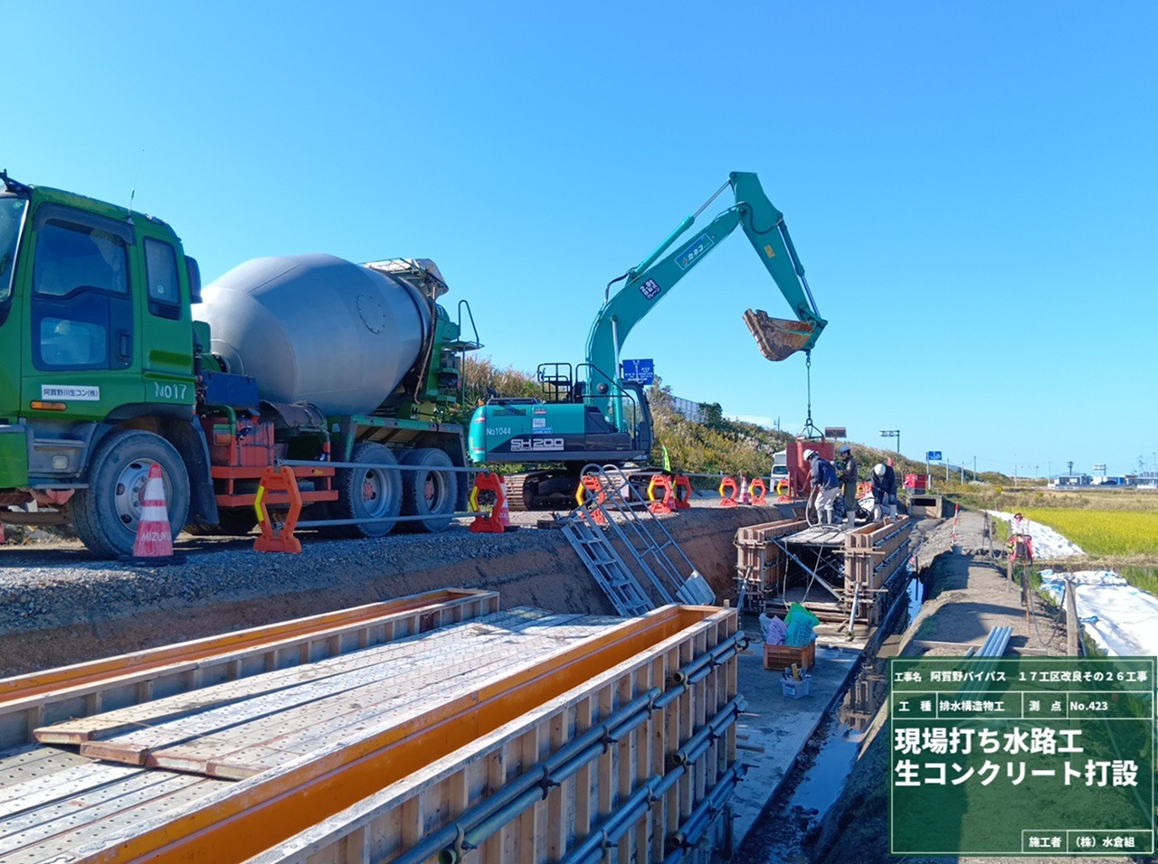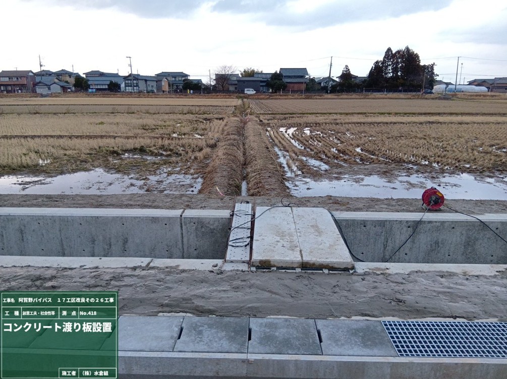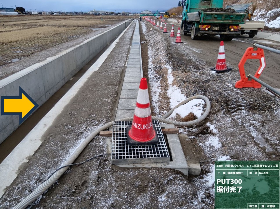 (1)新しい水路の本体の生コンクリートを運搬する大型車両の出入が週3回程度あります。