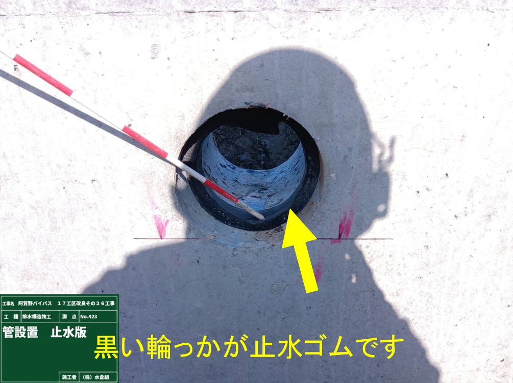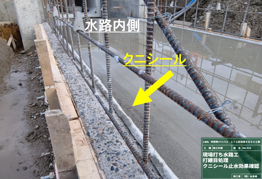 ○継目から用水の漏れ予防のため、クニシールという止水材を水路底と壁の継目全部に入れています。