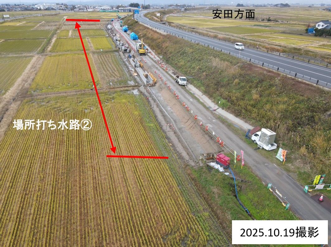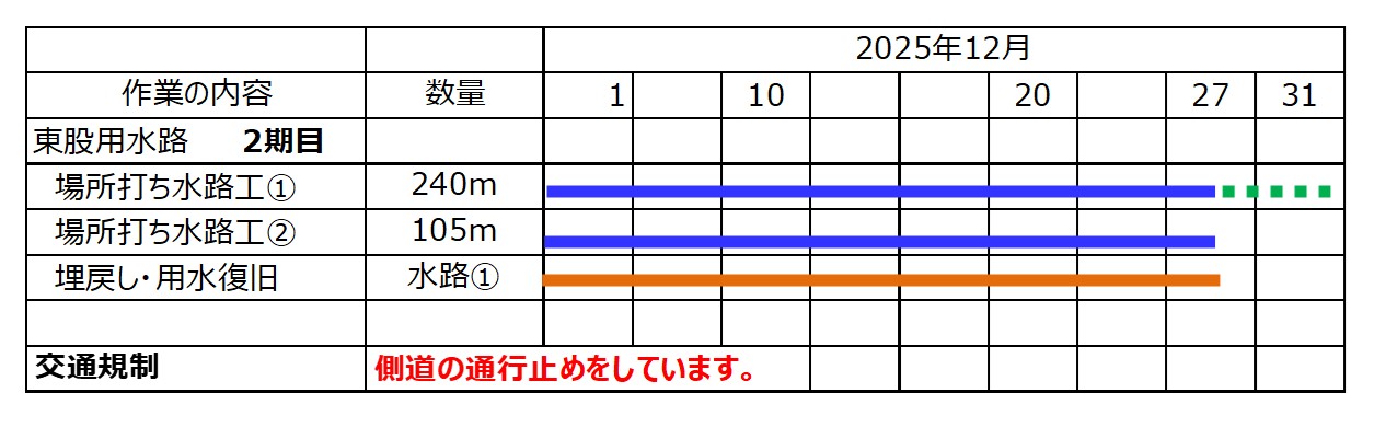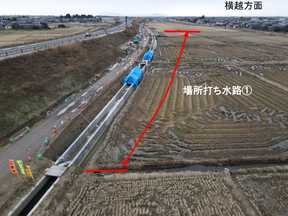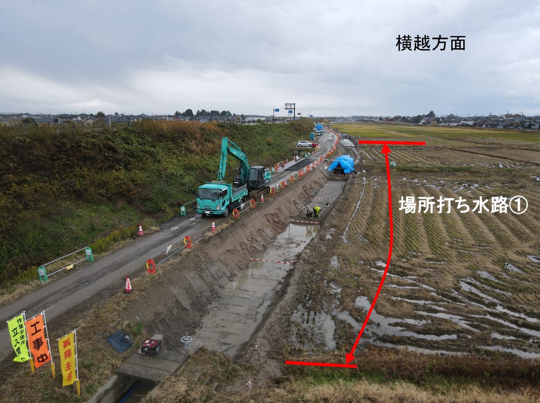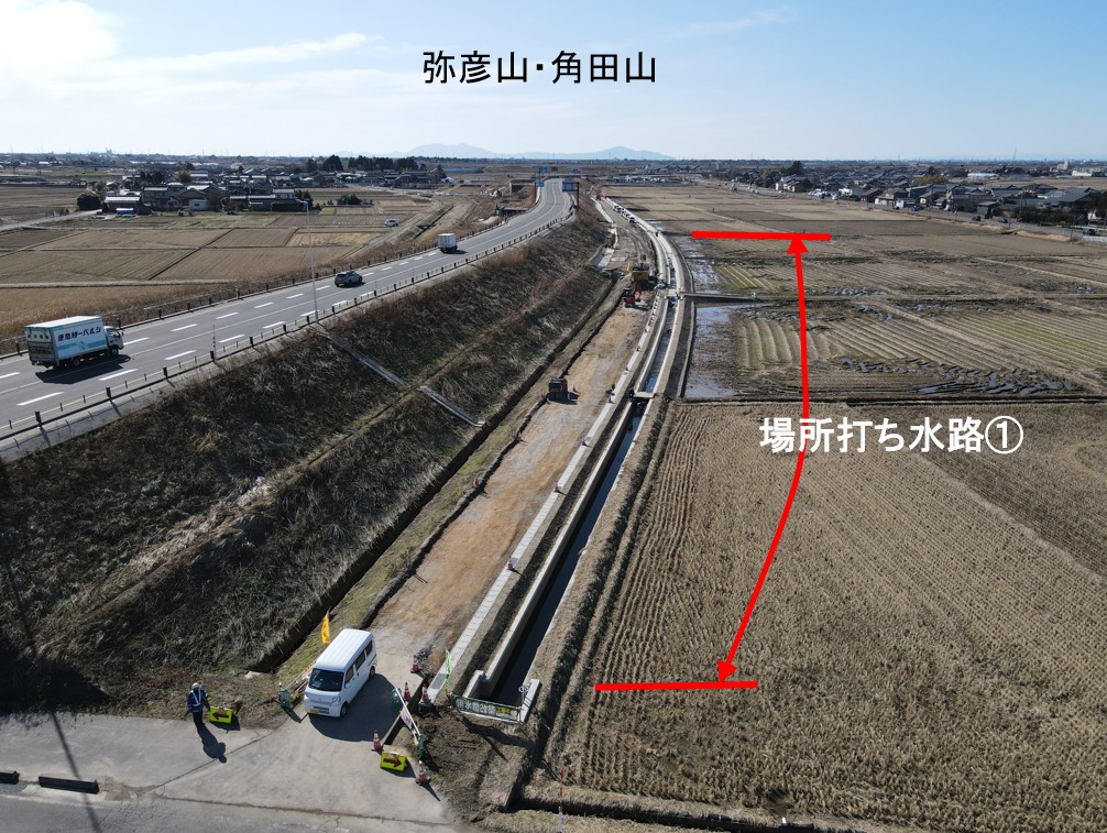 1月8日ごろから次の場所(場所打ち水路②)で現在の用水路のとりこわし約50mを予定しています。