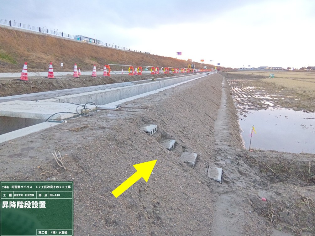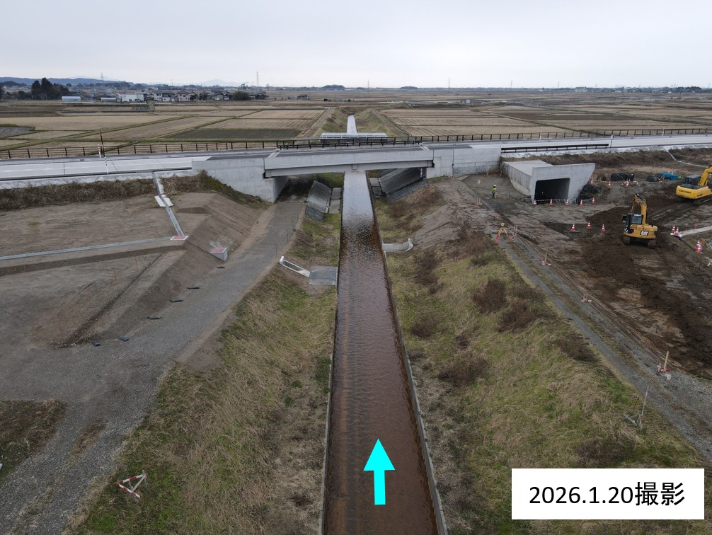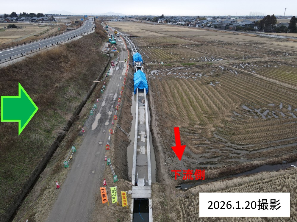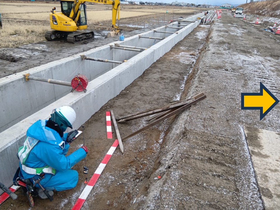 1月8日ごろから次の場所(場所打ち水路②)で現在の用水路のとりこわし約50mを予定しています。