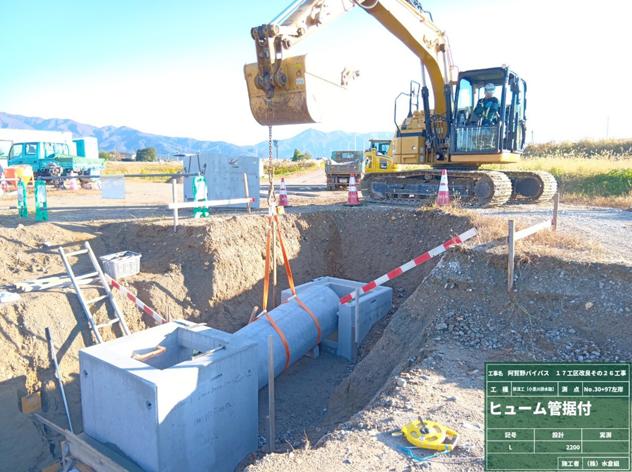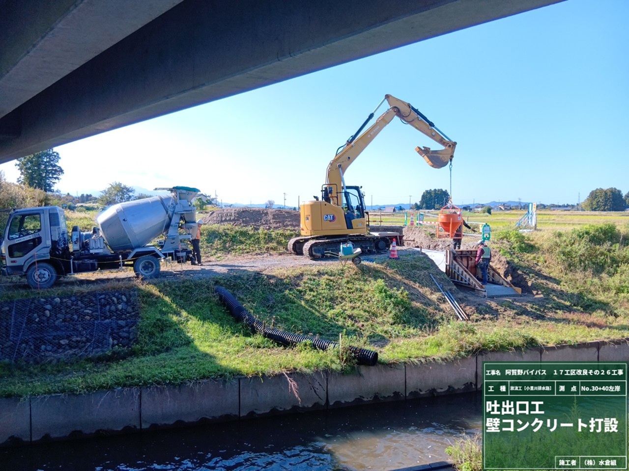 ○水原バイパス小里川排水路、上流側と下流側で放流工の作業をおこなっています。