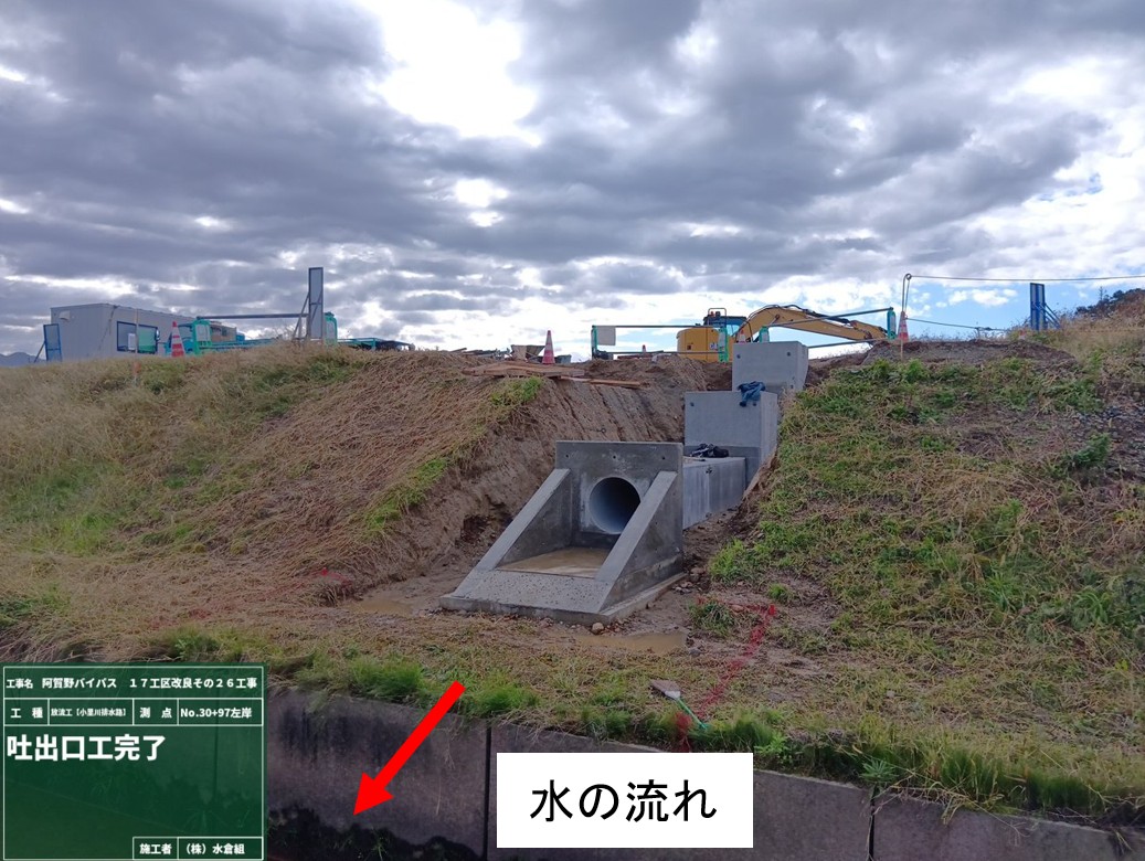 吐口のコンクリートを打設して、管理用通路の横断管きょを設置します。