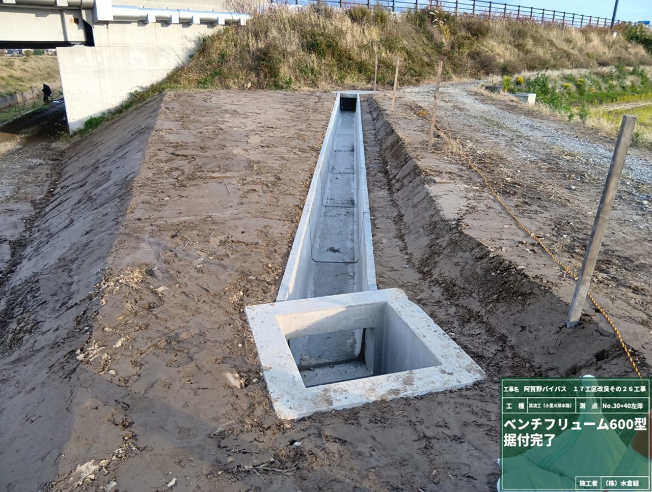 とりこわしが完了しました。場所打ち水路下流➀、上流②の2箇所で新しい用水路をつくります。