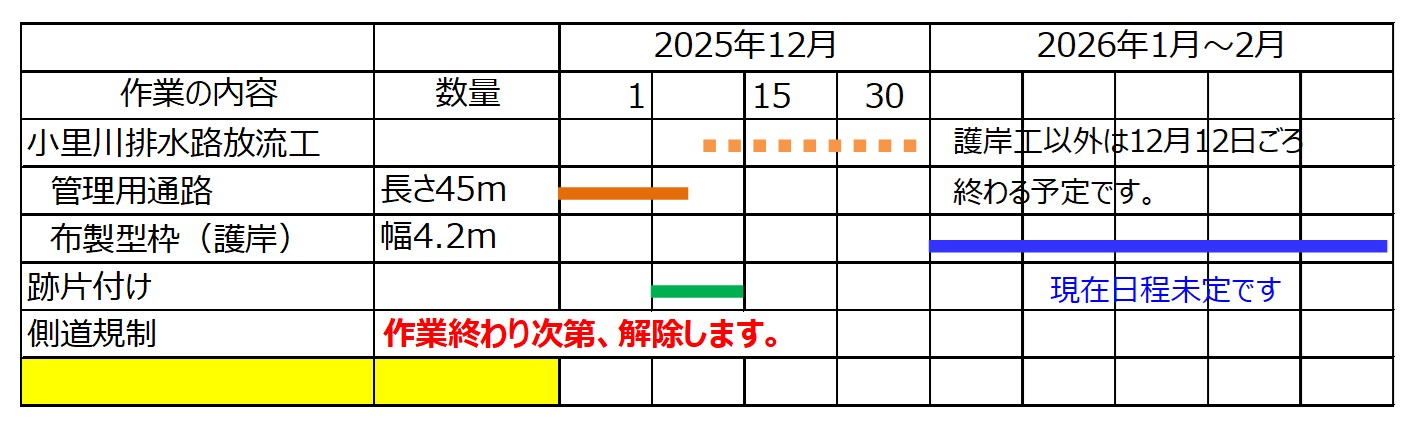 12月現在日程は現在未定ですが、吐口部下の護岸復旧を予定しています。