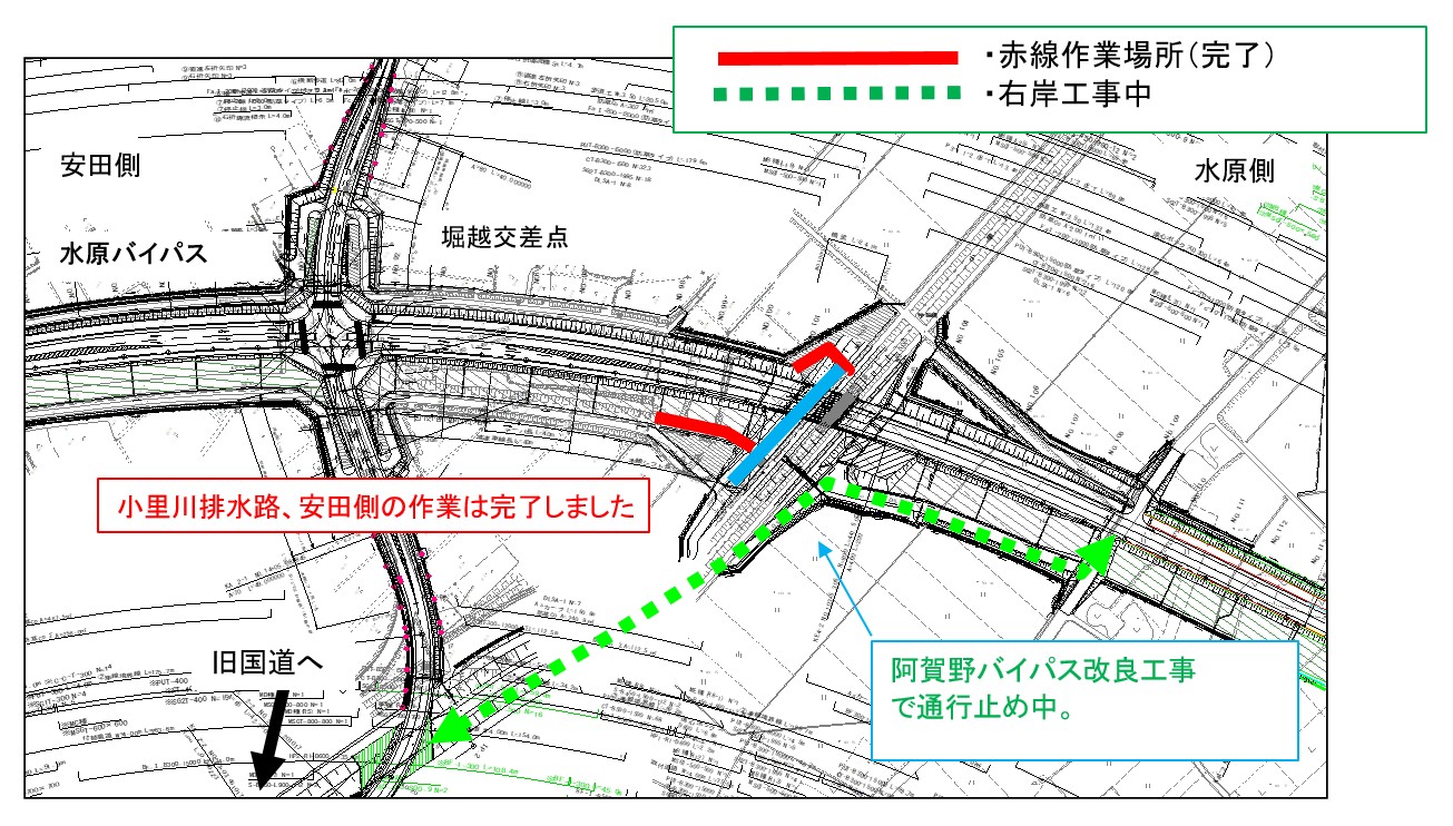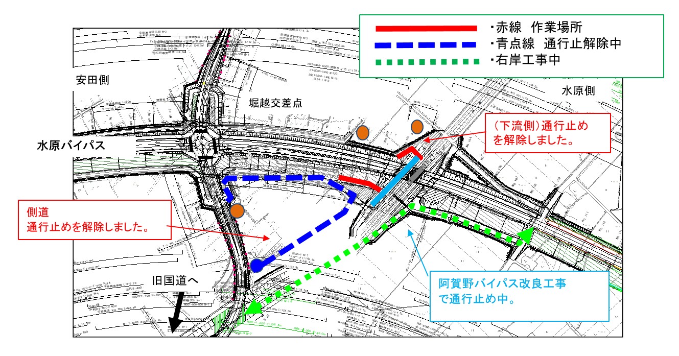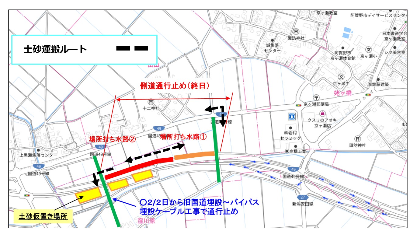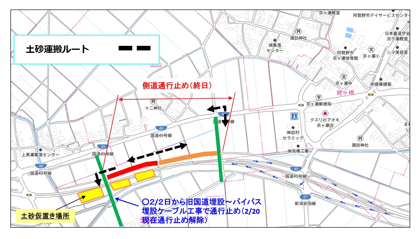 | 規制形態 | 窪川原交差点(阿賀野バイパス) 車線減少 東股用水路・側道 一部側道区間通行止め |