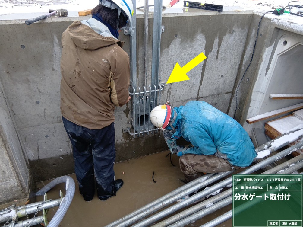 ○新しい水路と旧水路の接続。工場製作品で仮水路を接続して水を流せるようにします。
