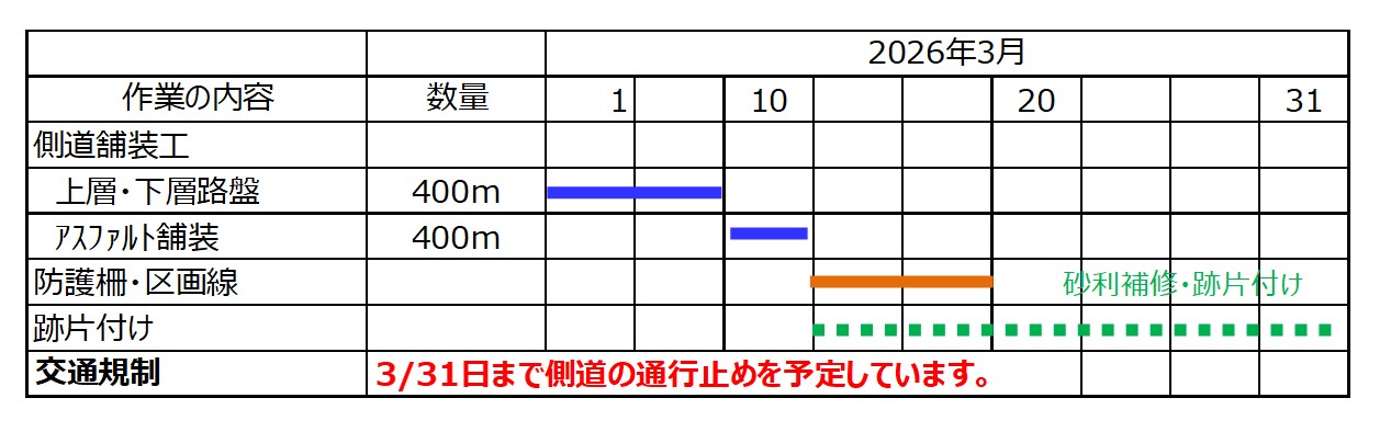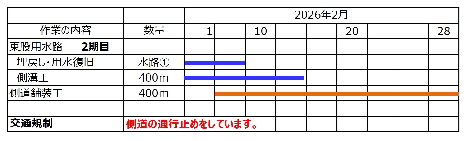 (2)側道を通すのは、国と土地改良区の工事完成検査後の4月からの予定です。