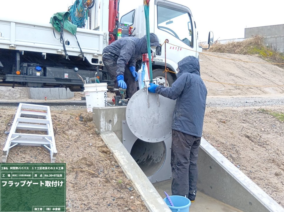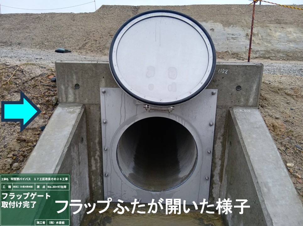 ○放流工の流末にフラップゲートをつけました。