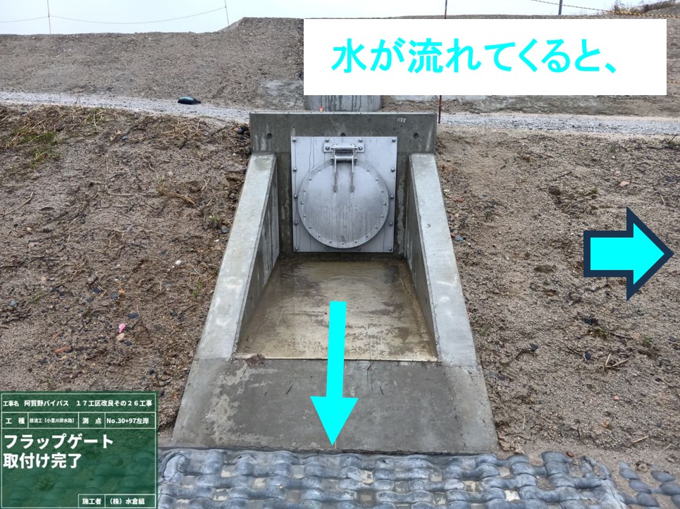□フラップゲートは、小里川排水路が満水になった時に上流に水が逆流しないようにする、排水の蓋のようなものです。