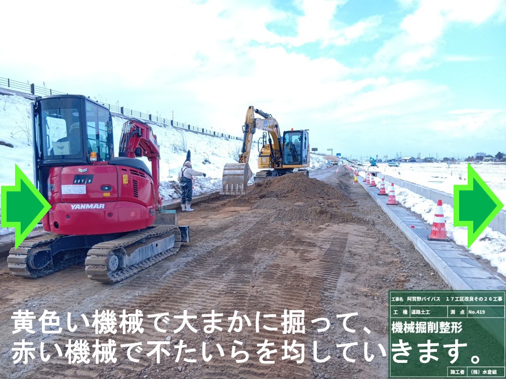 ○側道に盛土をして、作業場所をひろげて作業の効率を上げます。(最後は道路になります)