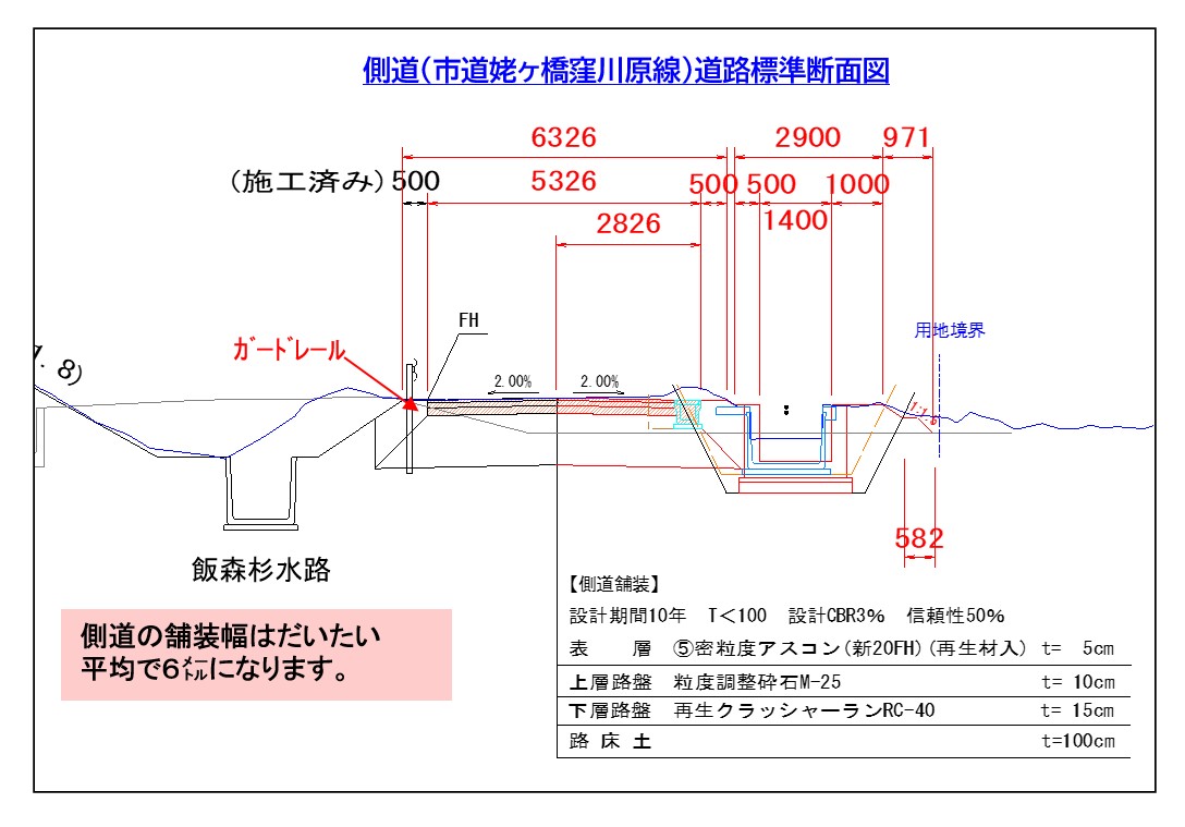 場所打ち水路下流①側道をアスファルト舗装にするため、今の側道を掘り起こして新しい砕石を入れる作業、上流②で新しい砕石(上層路盤)を行い3/10日ごろに側道の舗装をします。