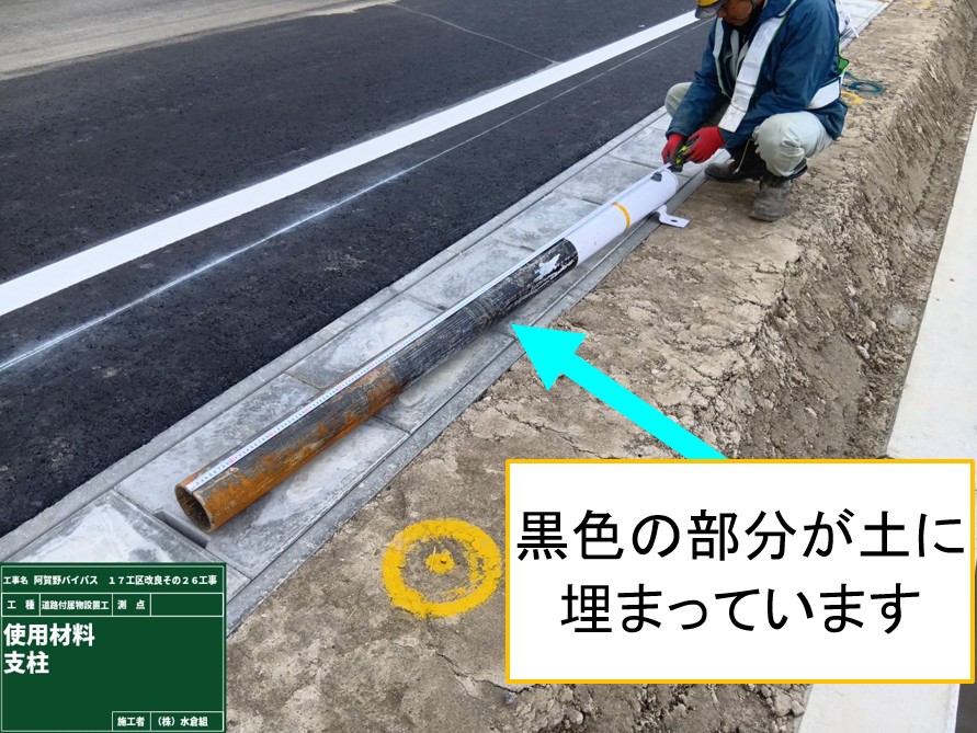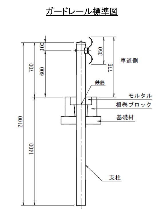 ガードレールは車がぶつかっても倒れないように支柱の長さは2メートル10センチで、土に埋まってる長さは12メートル40センチになります。(道路の種類や、積雪・海岸等などでいろいろ規格が違ってきます)