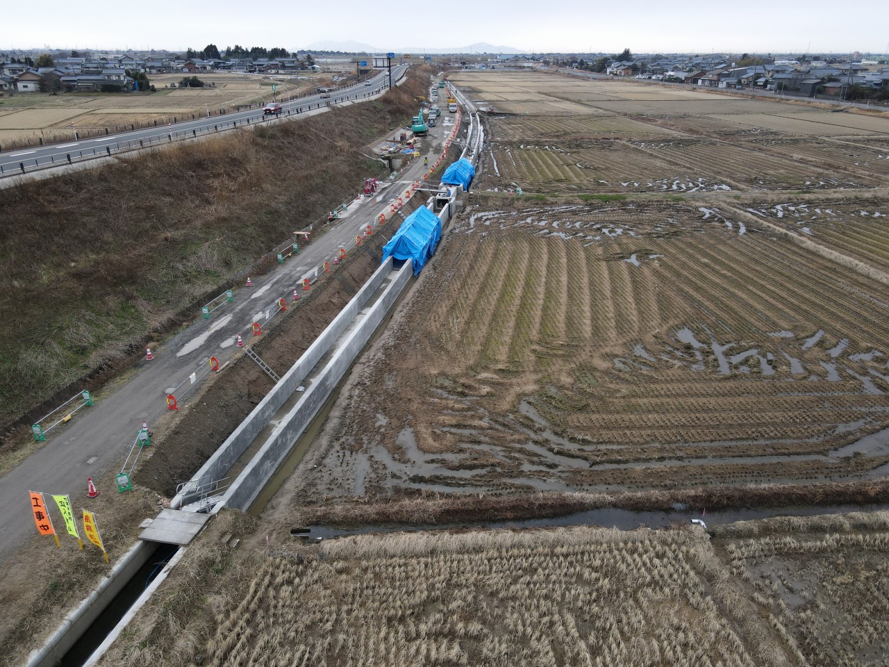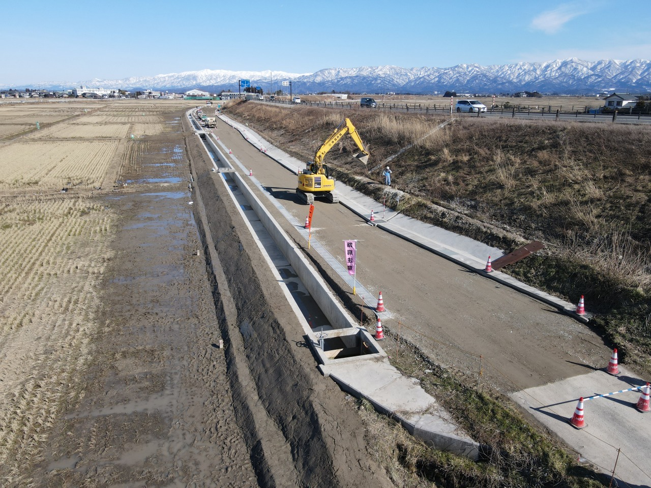 東股用水路・側道では引き続き新しい水路を築造しており、3月上旬には完了予定です。