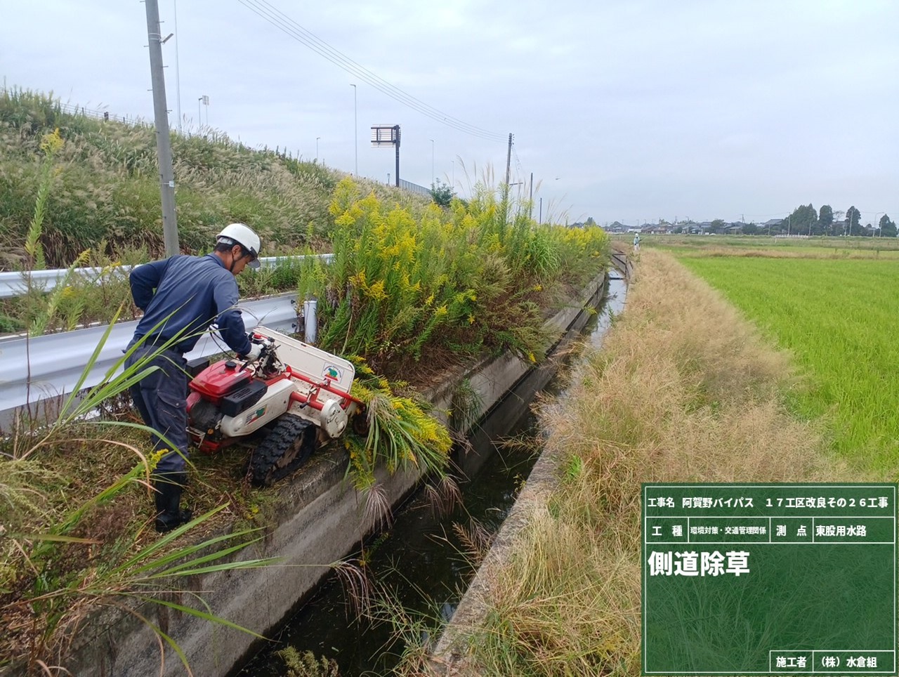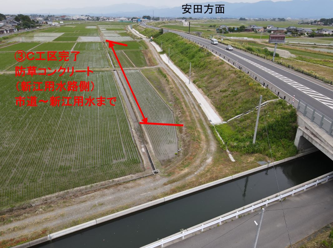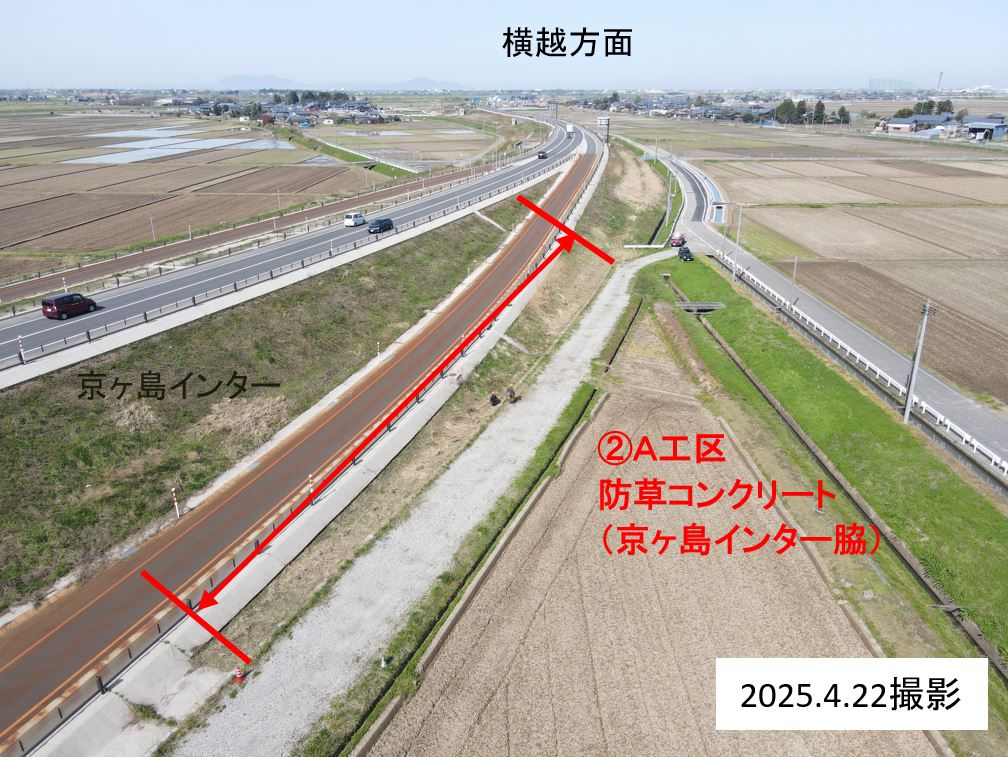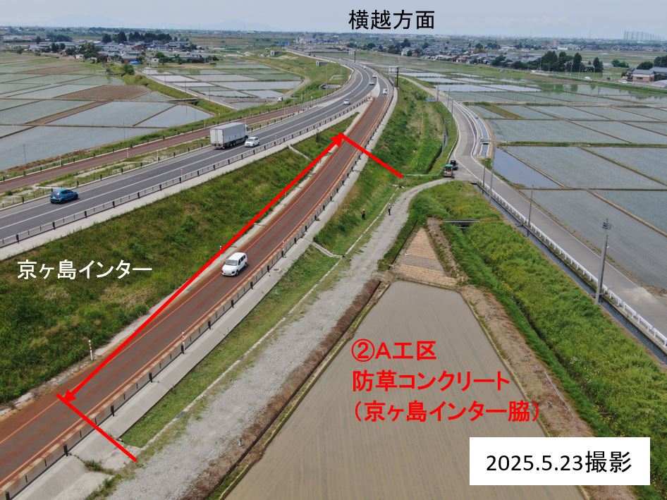 京ヶ島インターから新江用水路までの側道脇、バイパス盛土の防草コンクリートを行います。