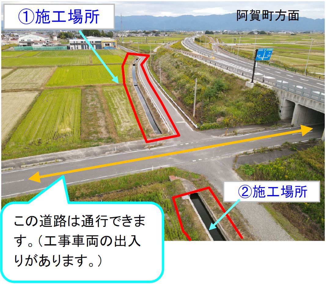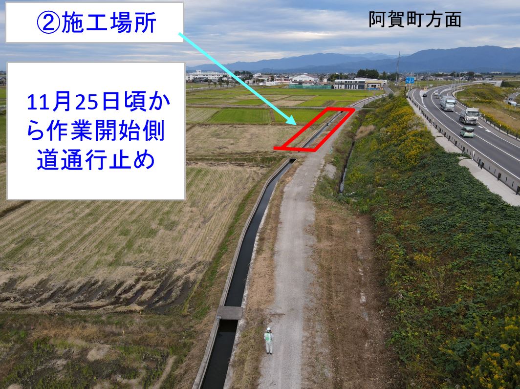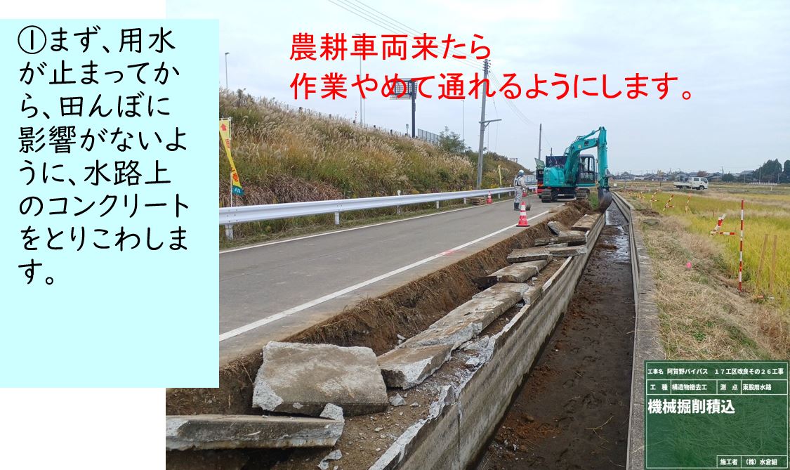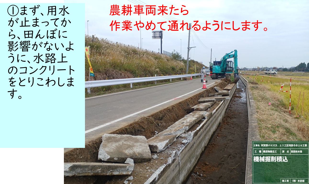 ①10月27日から作業をおこなっています。作業期間中終日側道を通行止めします。農道の迂回にご協力お願いします。