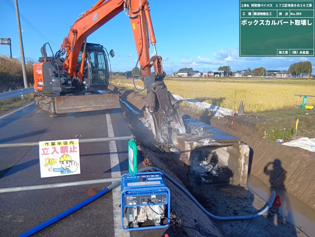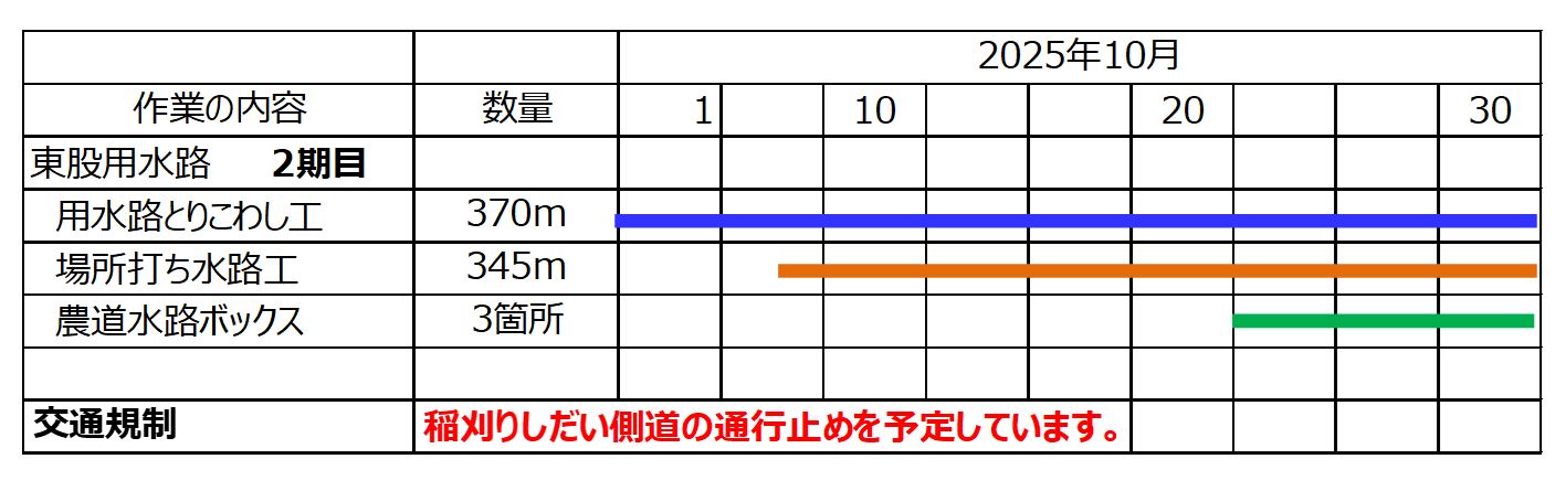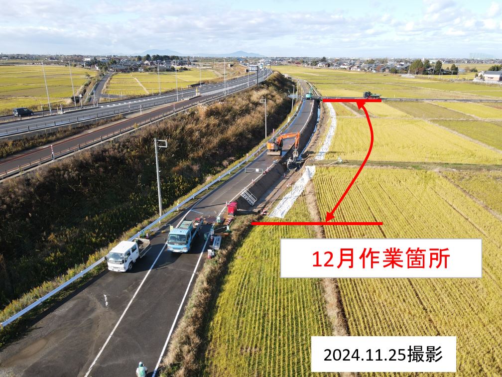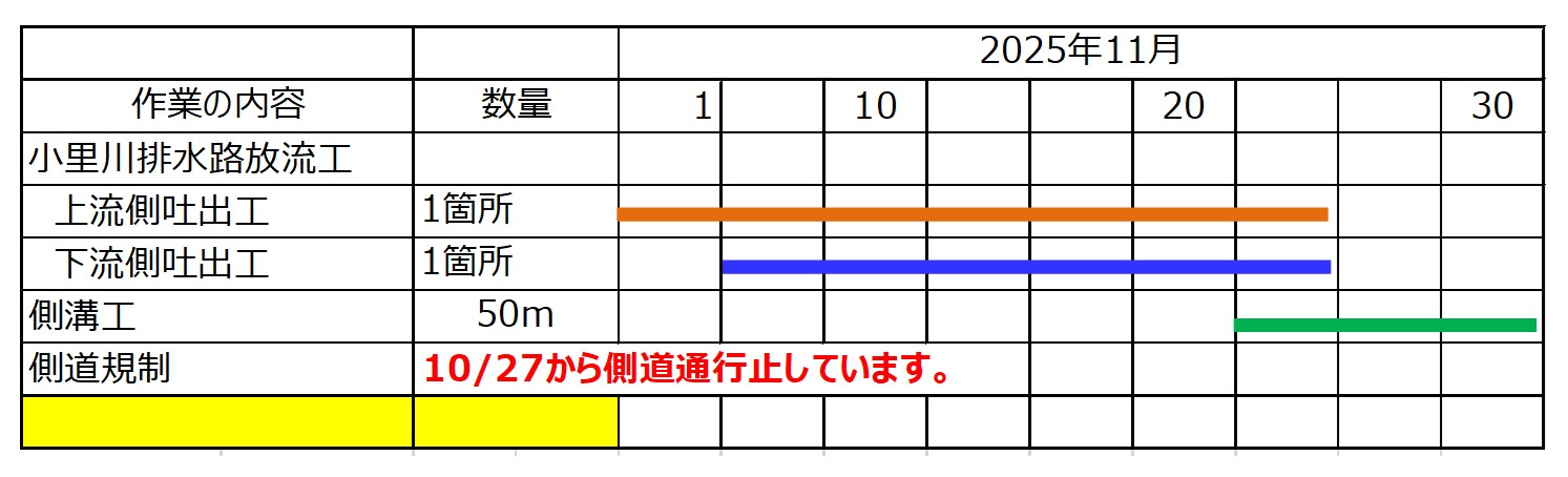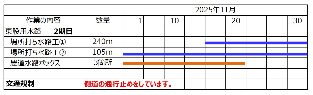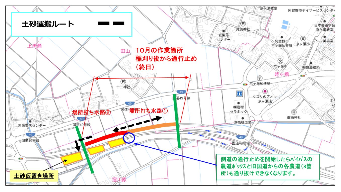 ①10月27日から作業をおこなっています。作業期間中終日側道を通行止めします。農道の迂回にご協力お願いします。