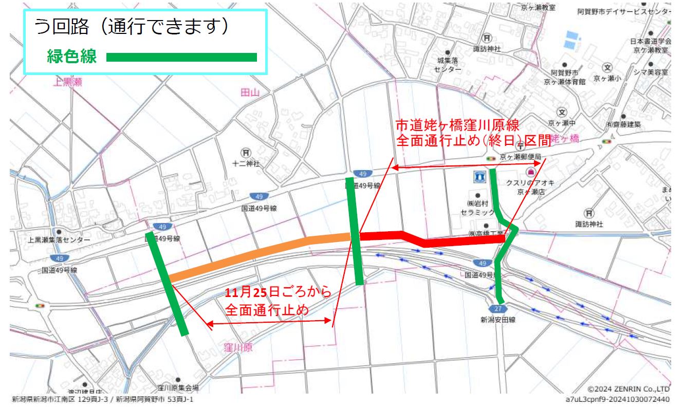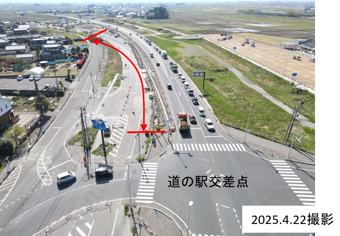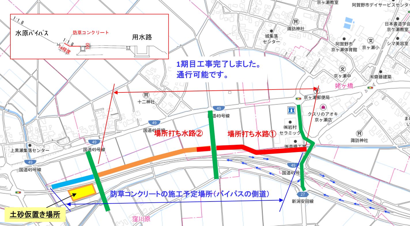| 規制形態 | 窪川原交差点(阿賀野バイパス) 車線減少 東股用水路・側道 一部側道区間通行止め |