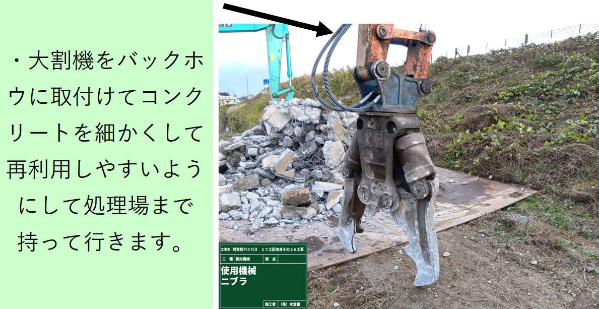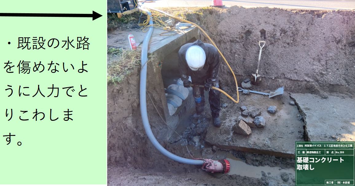 ➀水路上のコンクリートをこわします。