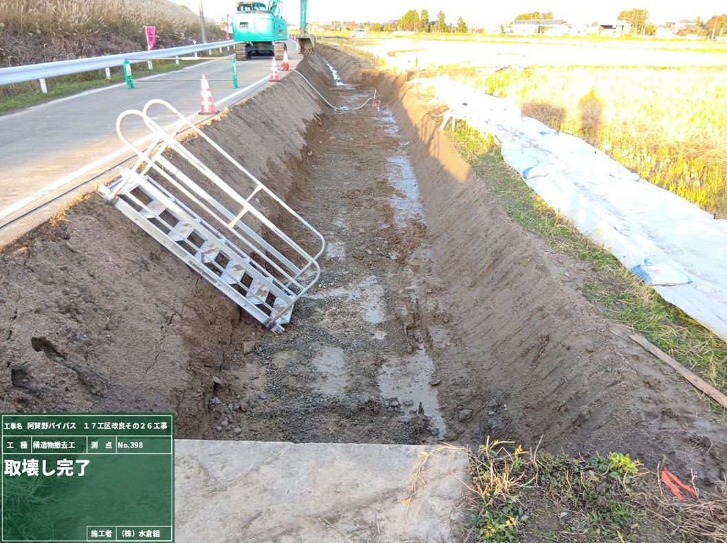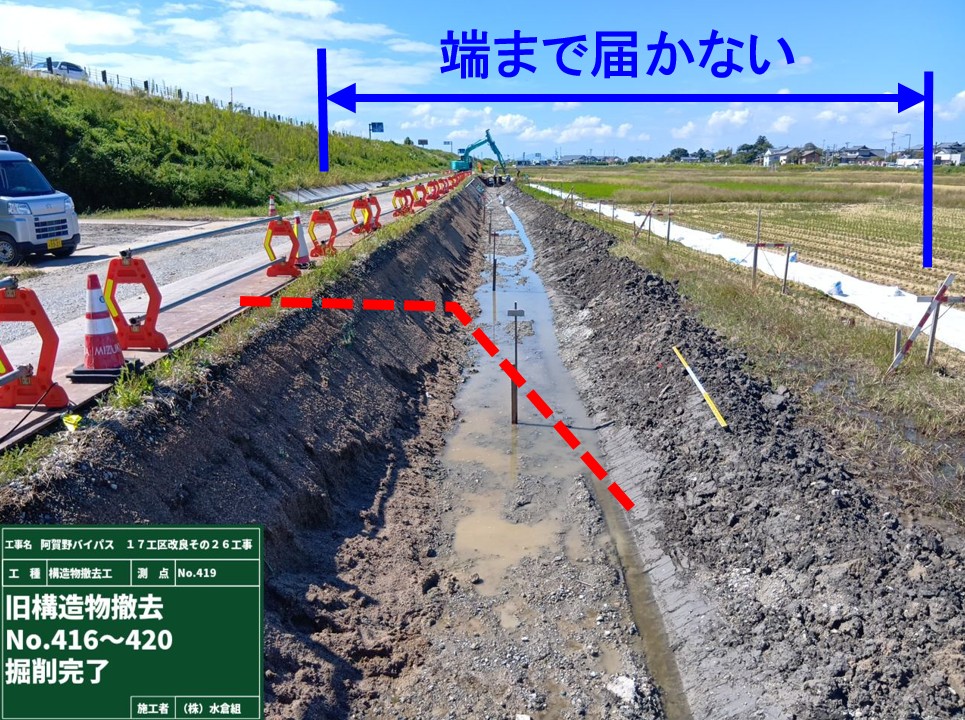 とりこわしが完了しました。場所打ち水路下流➀、上流②の2箇所で新しい用水路をつくります。