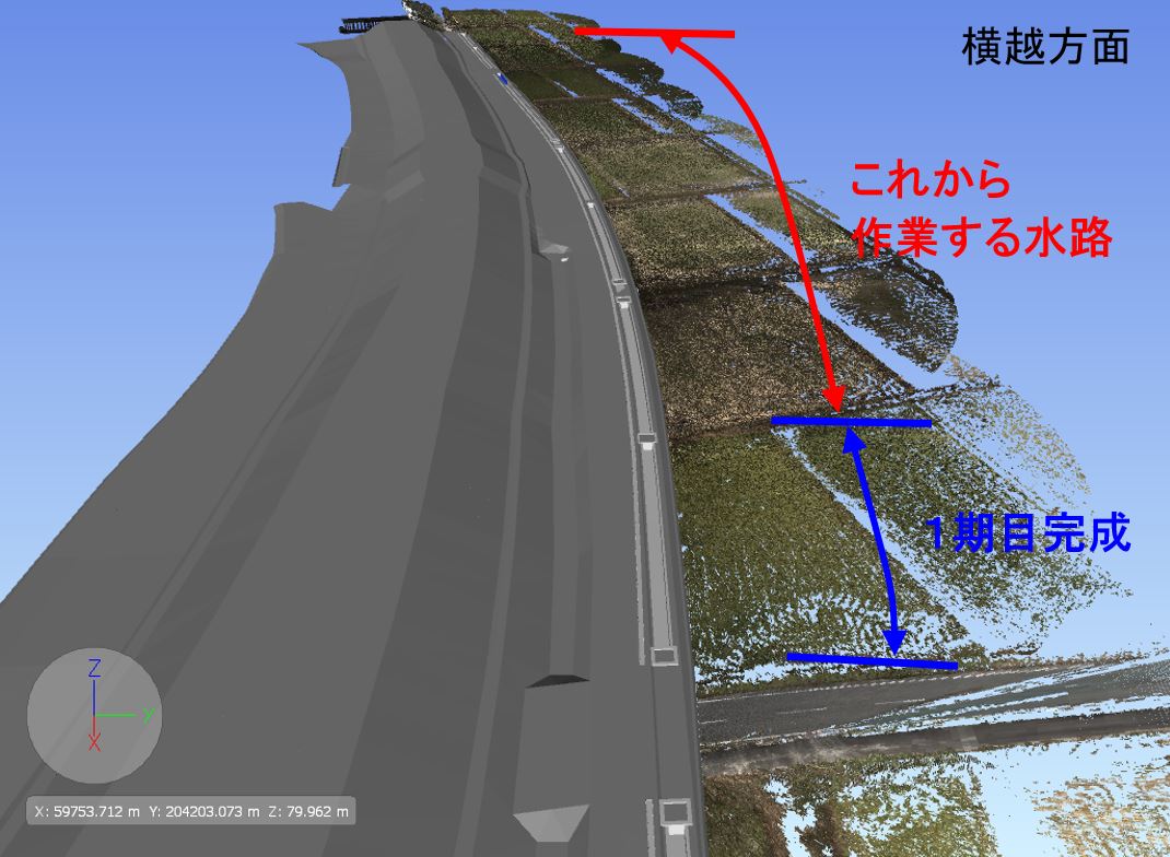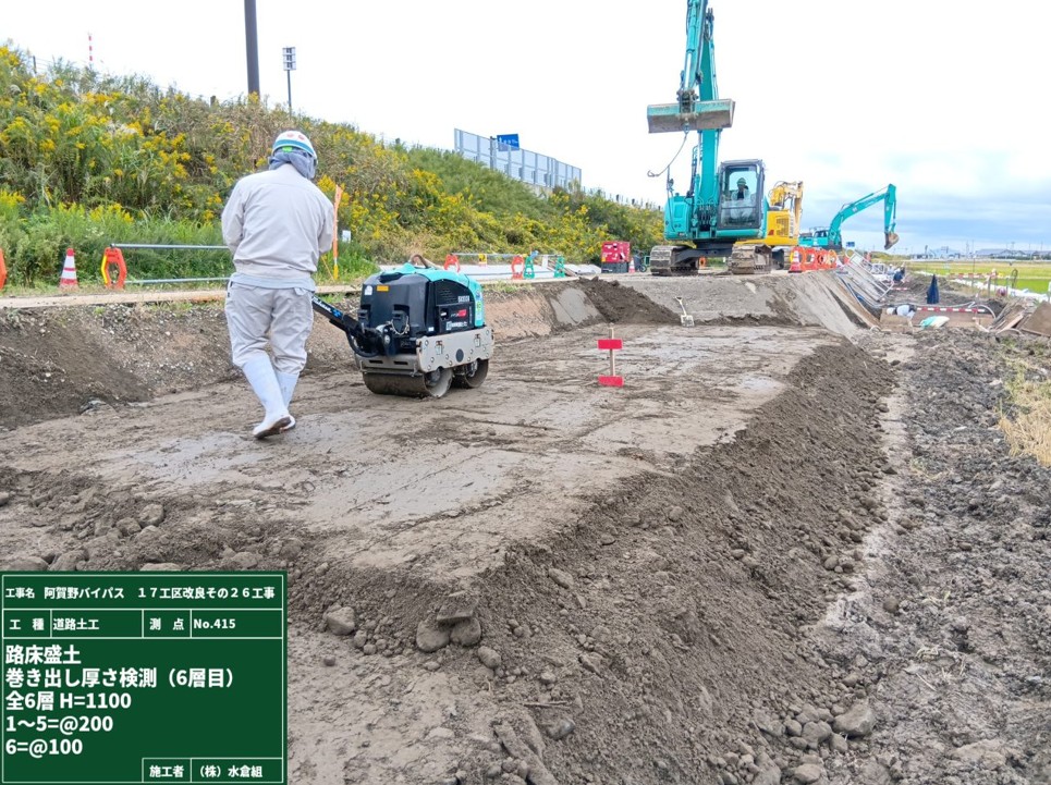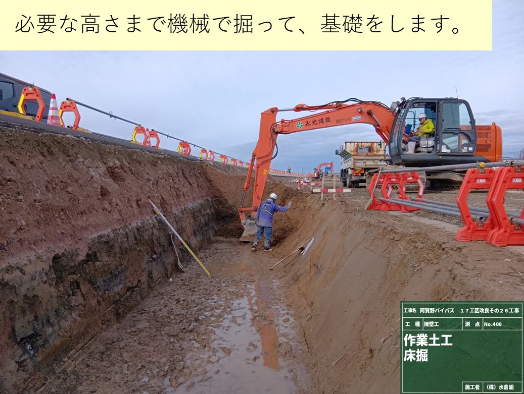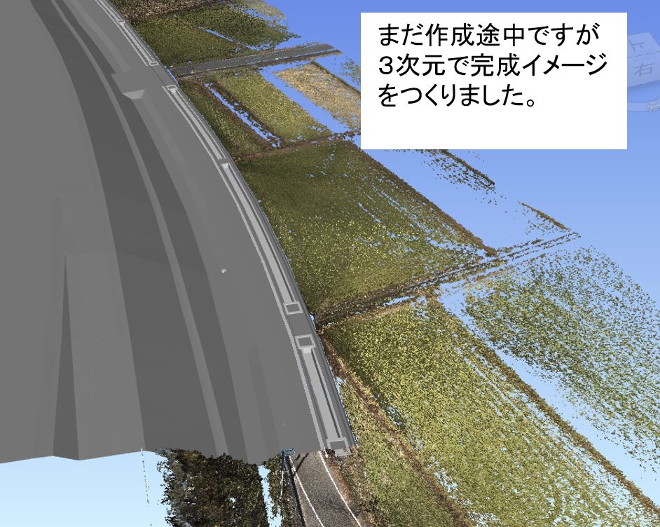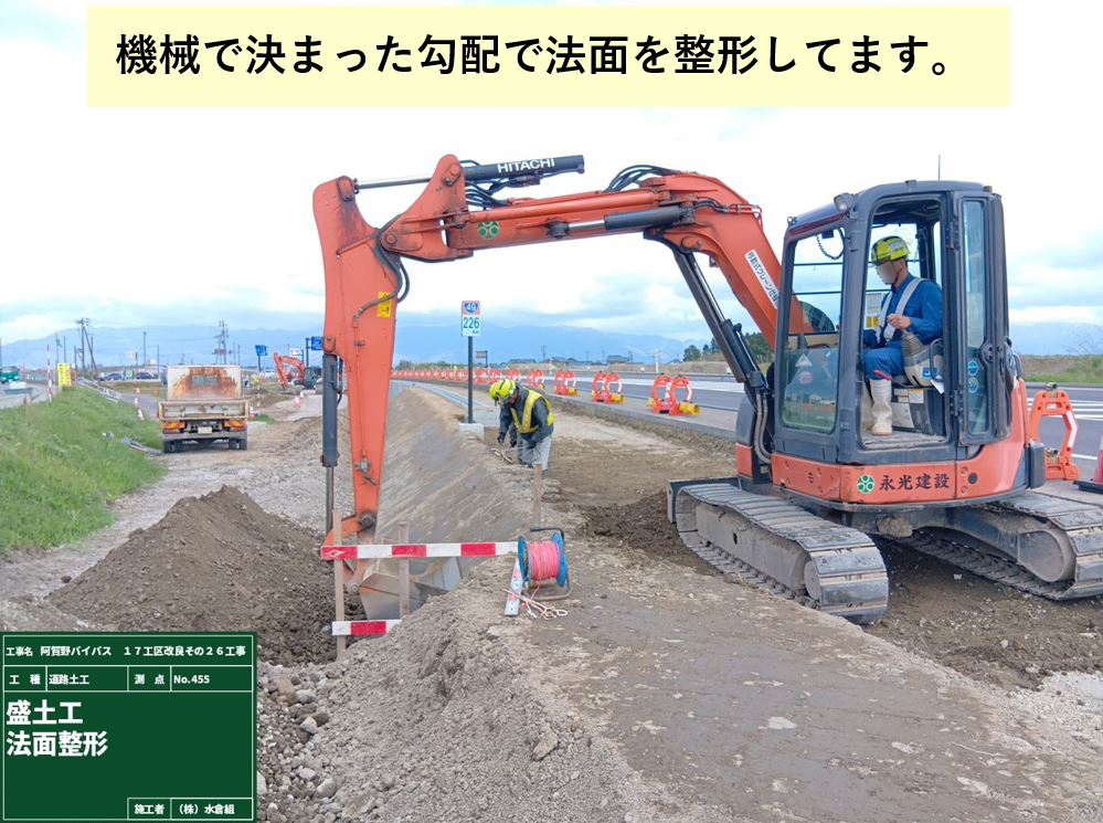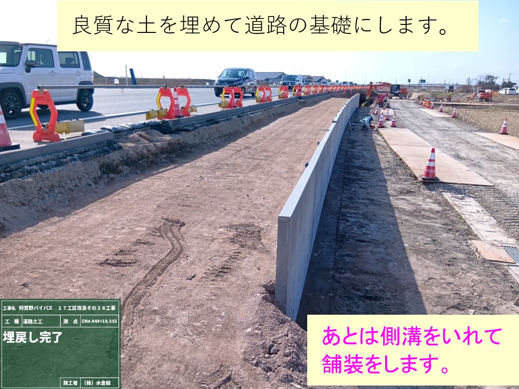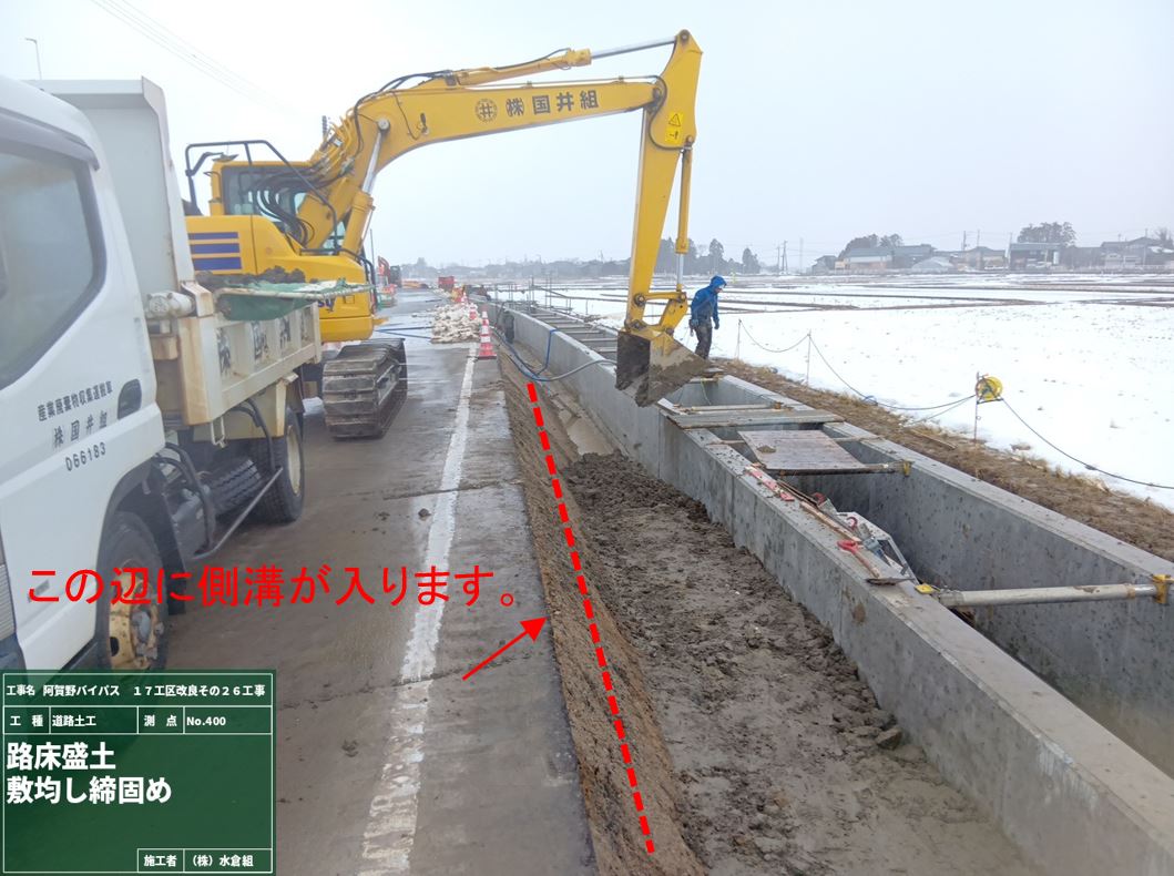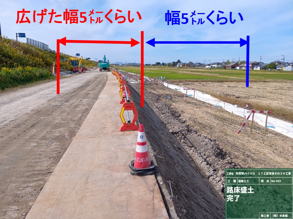 ○側道に盛土をして、作業場所をひろげて作業の効率を上げます。(最後は道路になります)