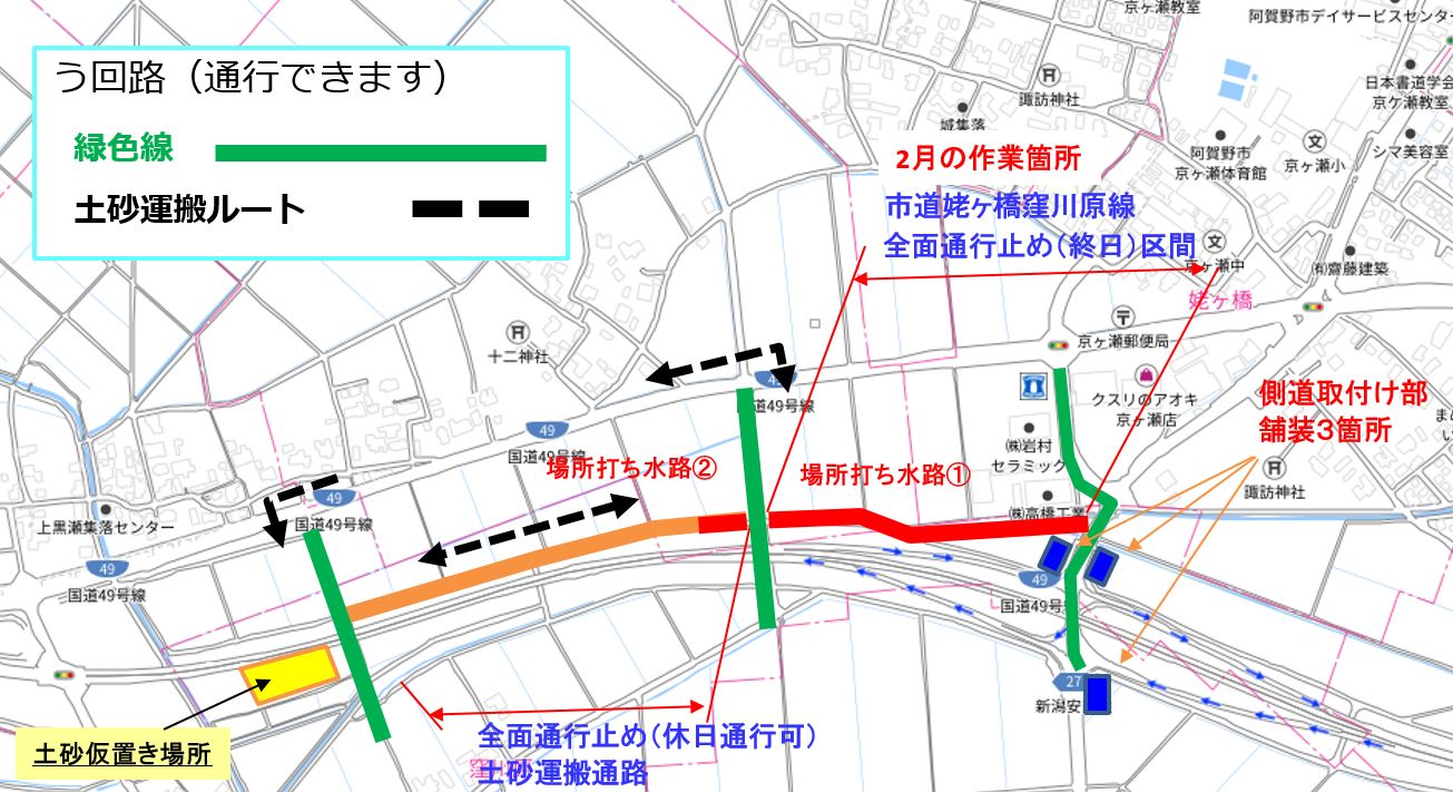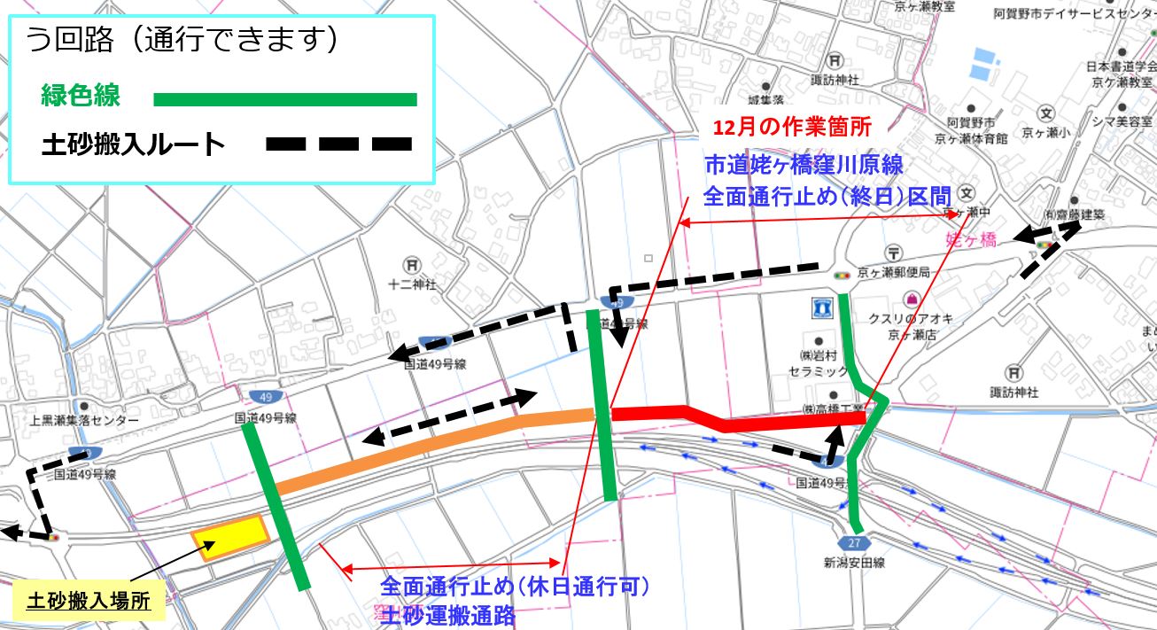 [搬入ルート]は持ってくる時は京ヶ島IC -姥ヶ橋から入り、取りに行く時は窪川原交差点から出るを予定しています。