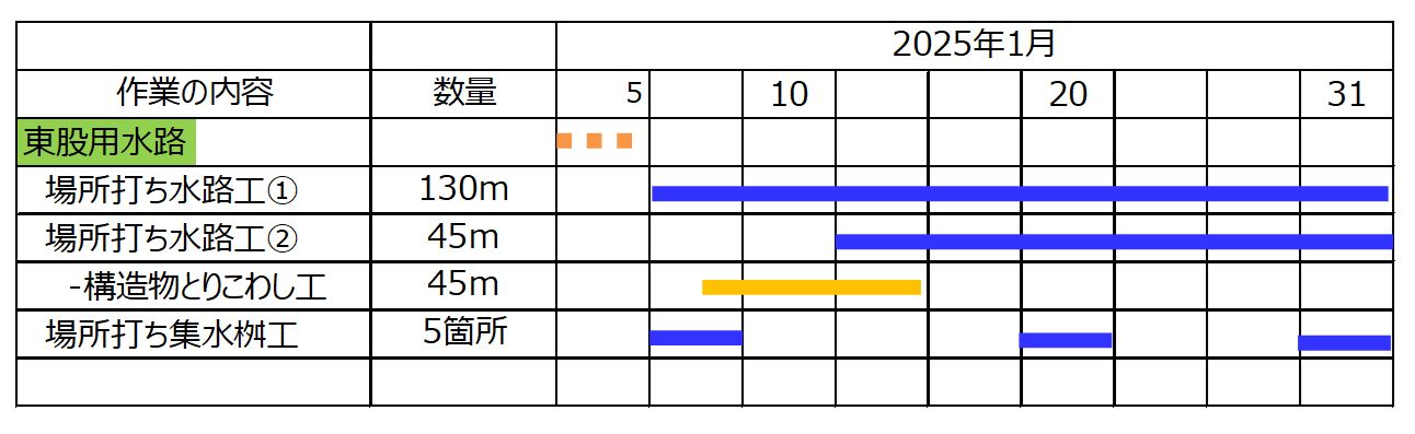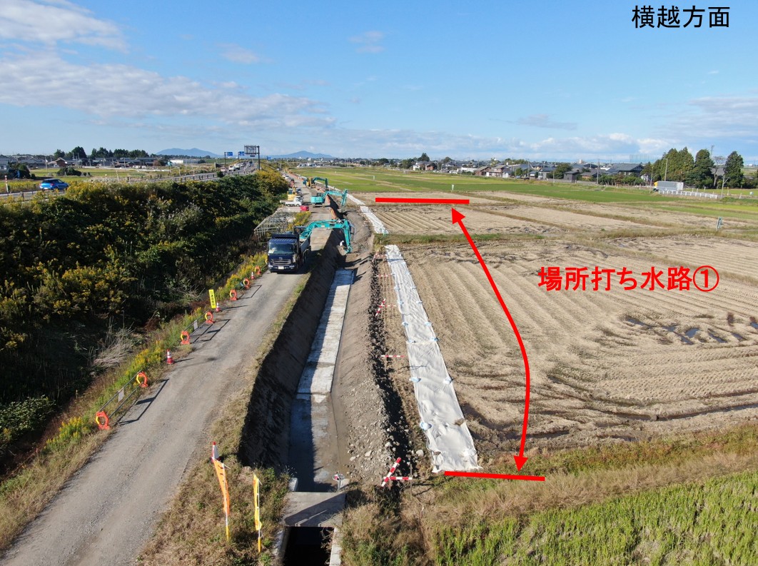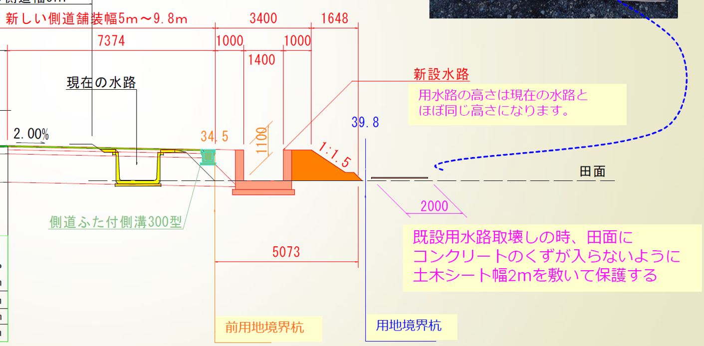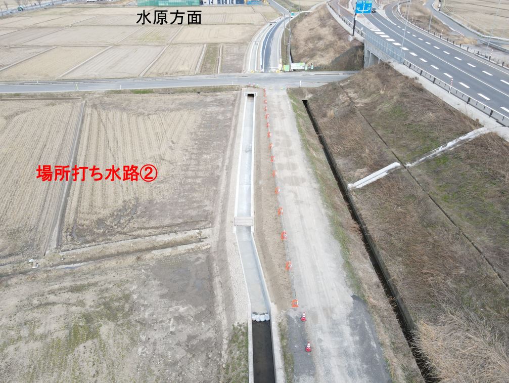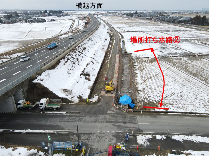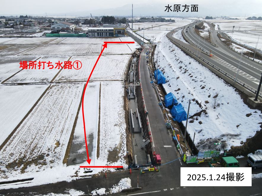 1月8日ごろから次の場所(場所打ち水路②)で現在の用水路のとりこわし約50mを予定しています。