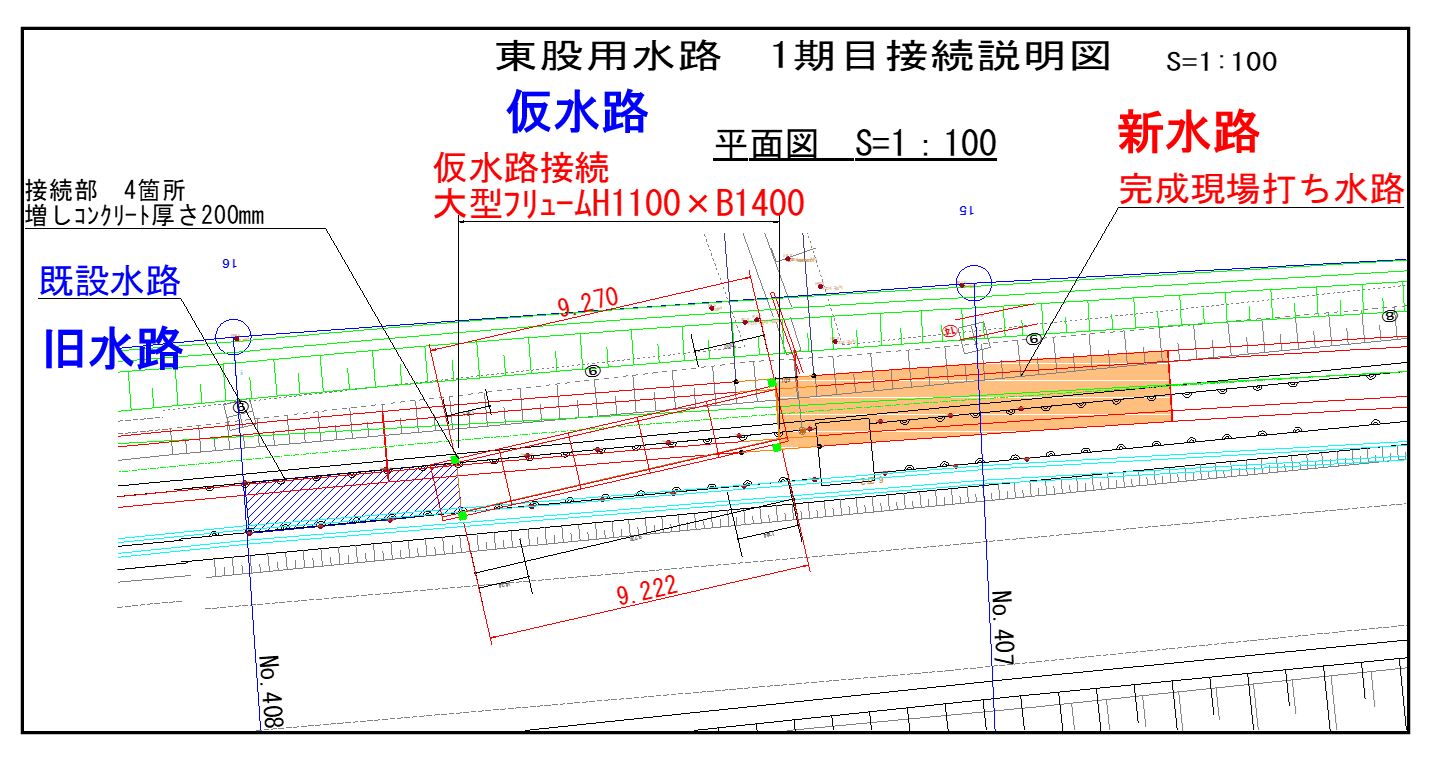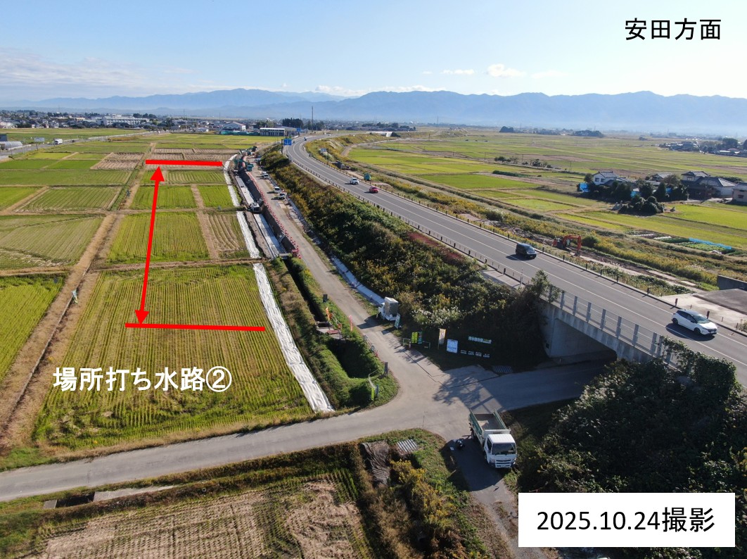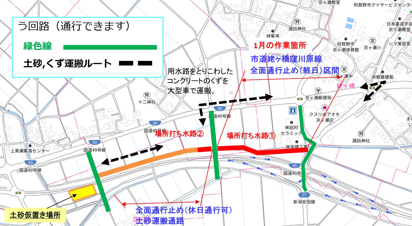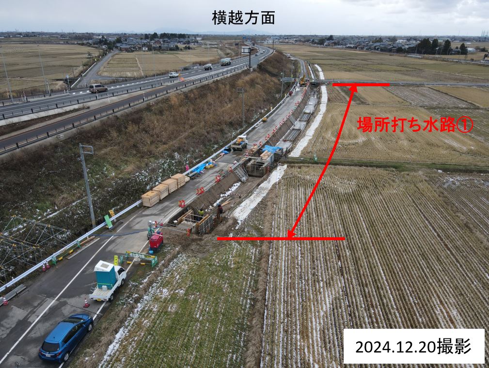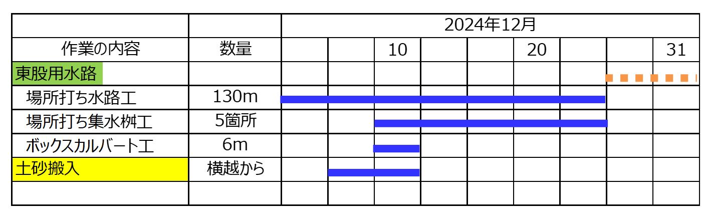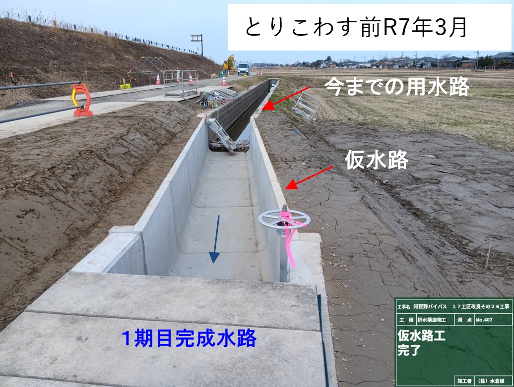 1月8日ごろから次の場所(場所打ち水路②)で現在の用水路のとりこわし約50mを予定しています。