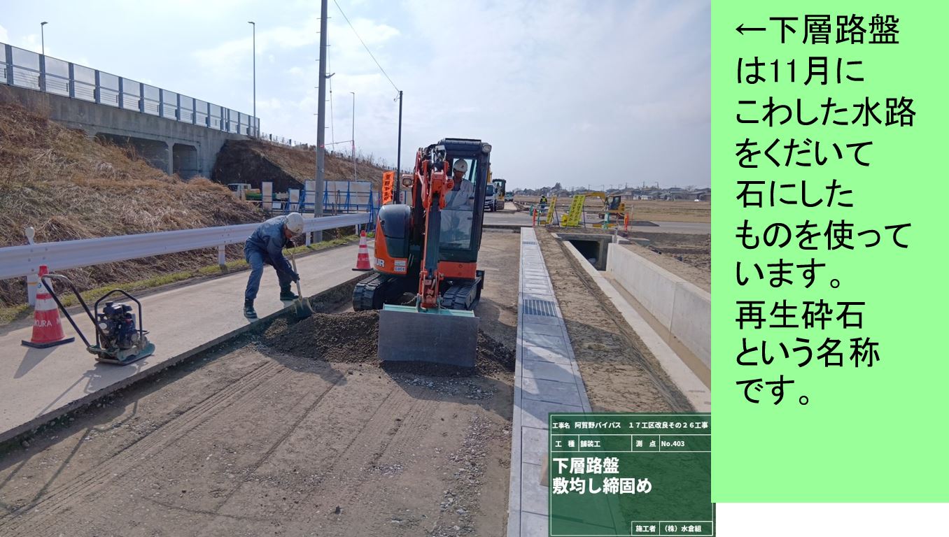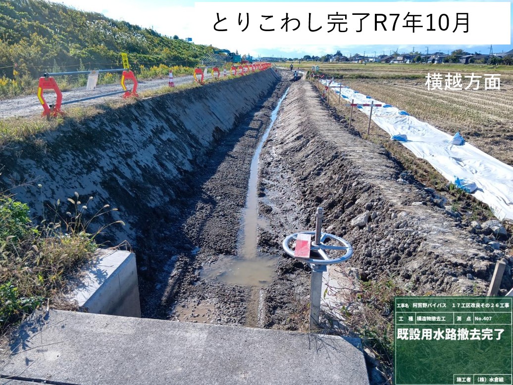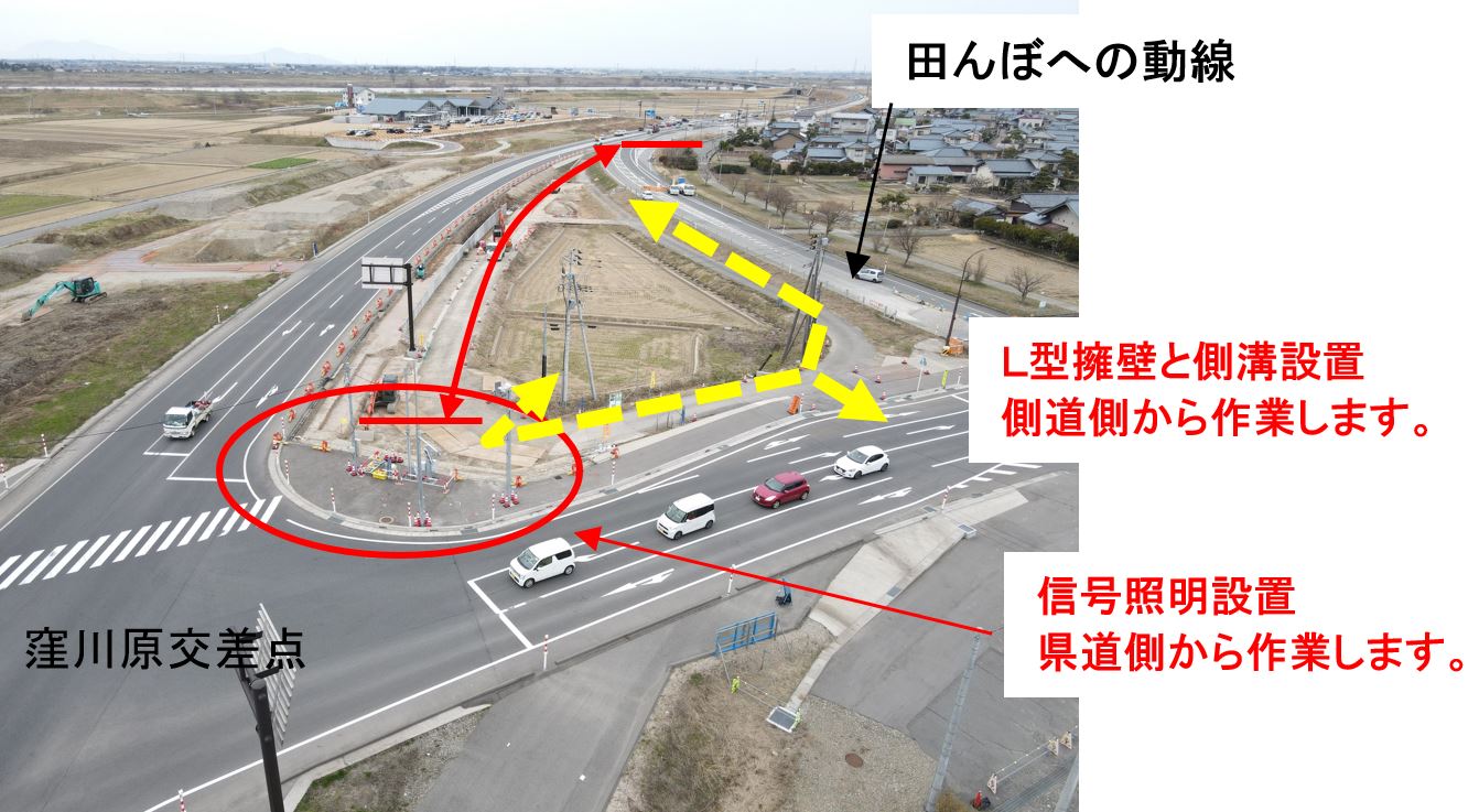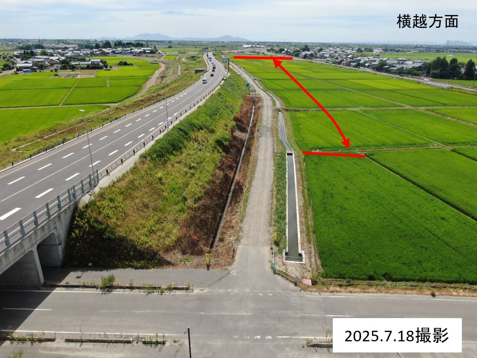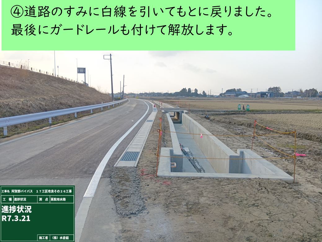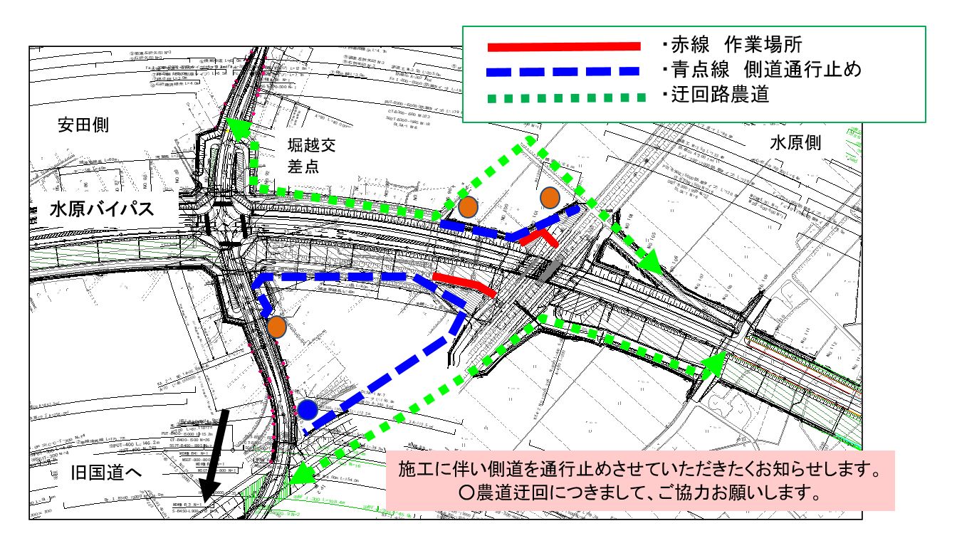 ・バイパス下の通路(管理用通路)については、敷砂利が固くなるまで通行止めとします。農道の迂回にご協力お願いします。
