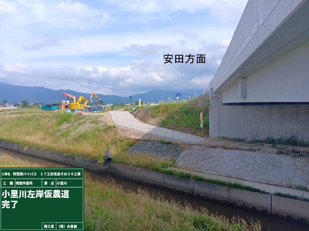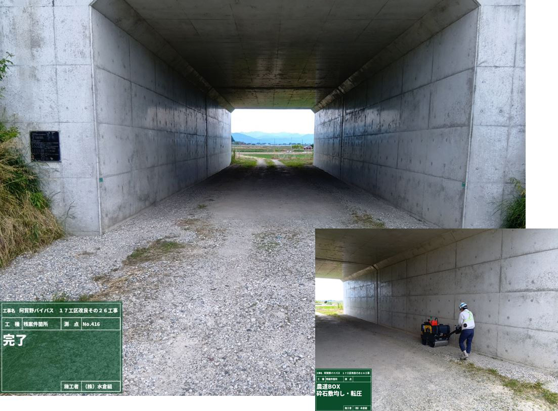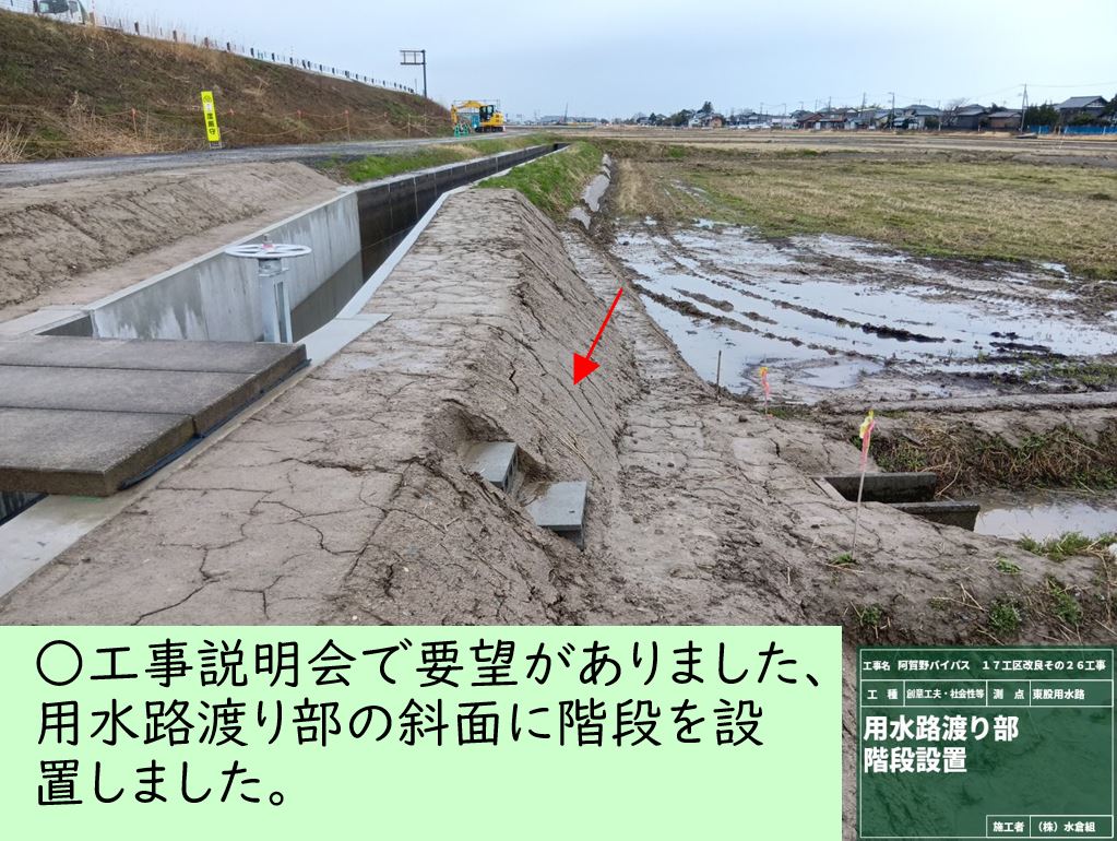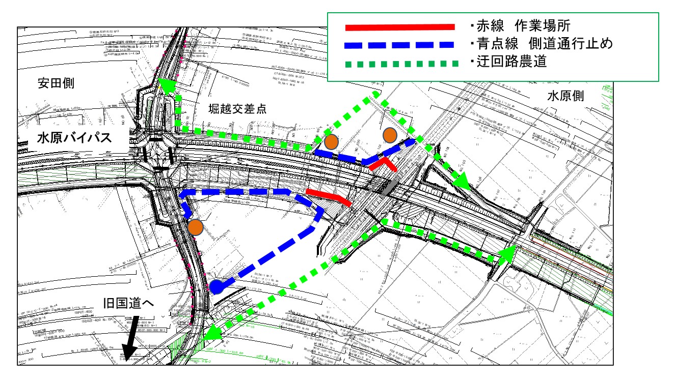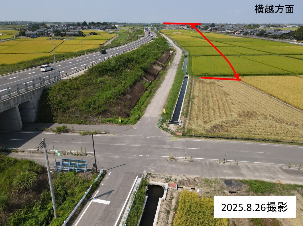 ・バイパス下の通路(管理用通路)については、敷砂利が固くなるまで通行止めとします。農道の迂回にご協力お願いします。