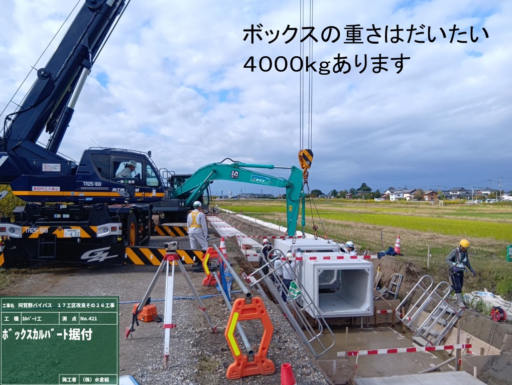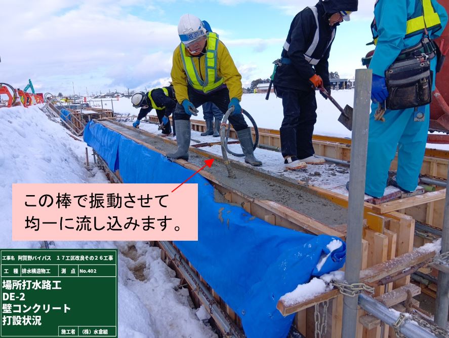 (1)新しい水路の本体の生コンクリートを運搬する大型車両の出入りが週3回程度あります。