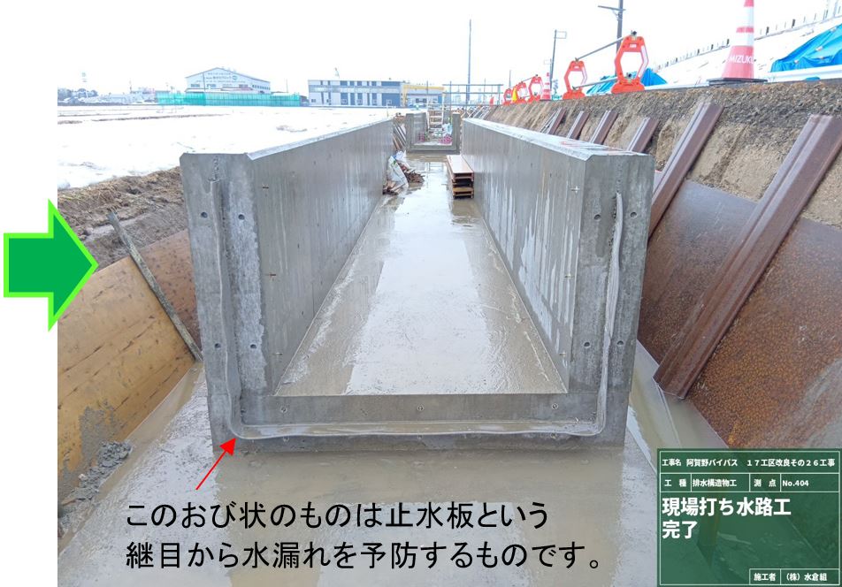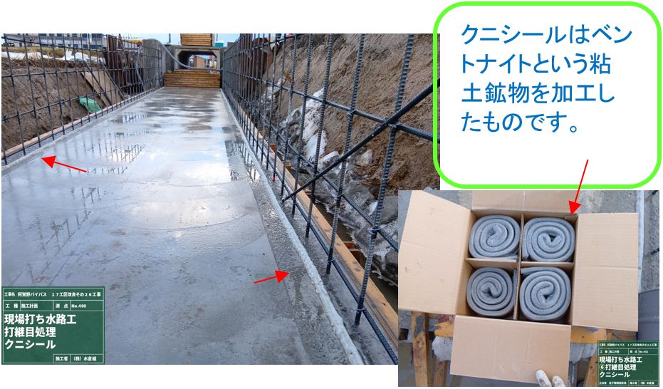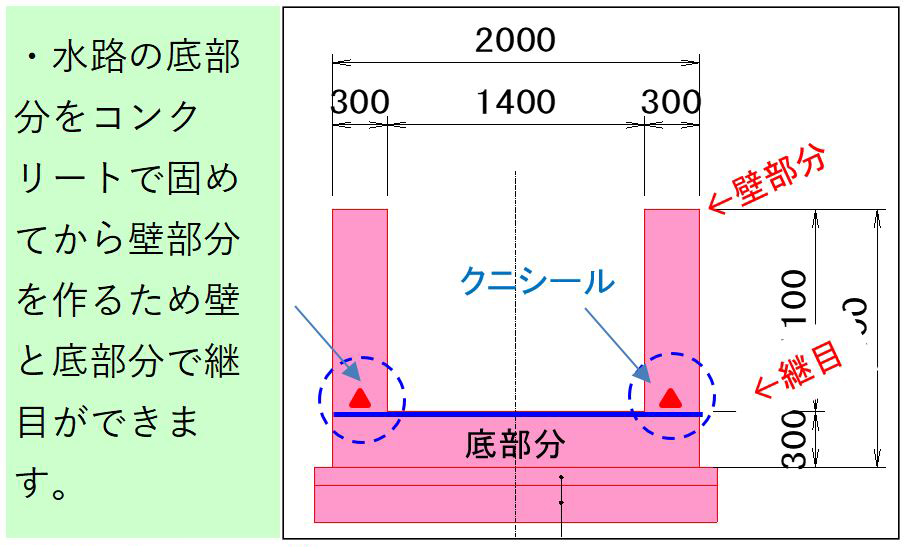 ○継目から用水の漏れ予防のため、クニシールという止水材を水路底と壁の継目全部に入れています。
