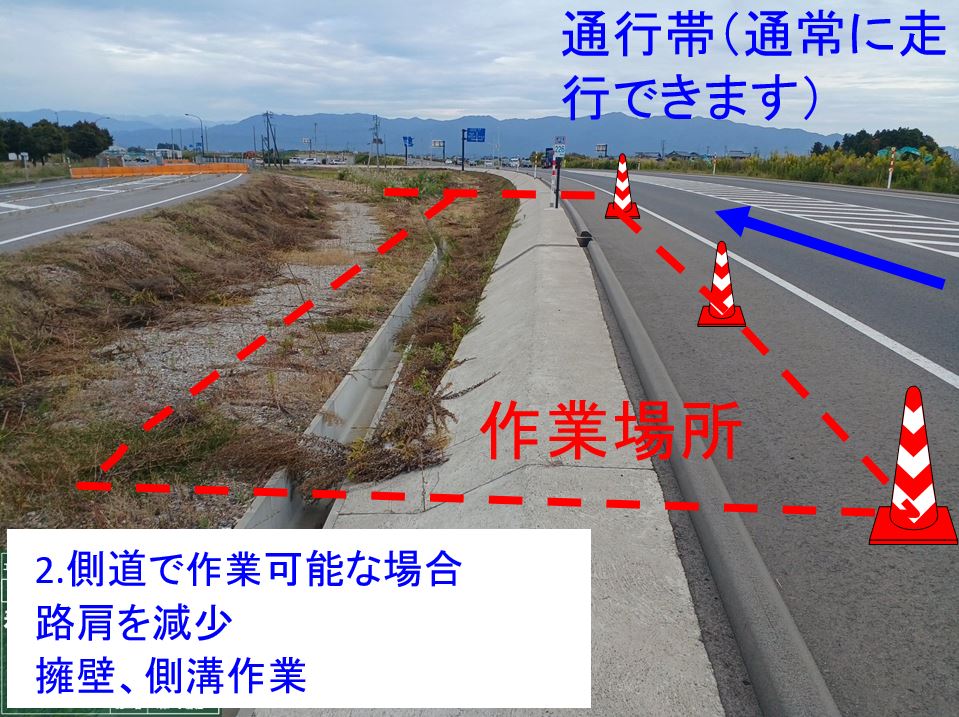 作業時側道を通行止め、県道の片側交互通行規制します。