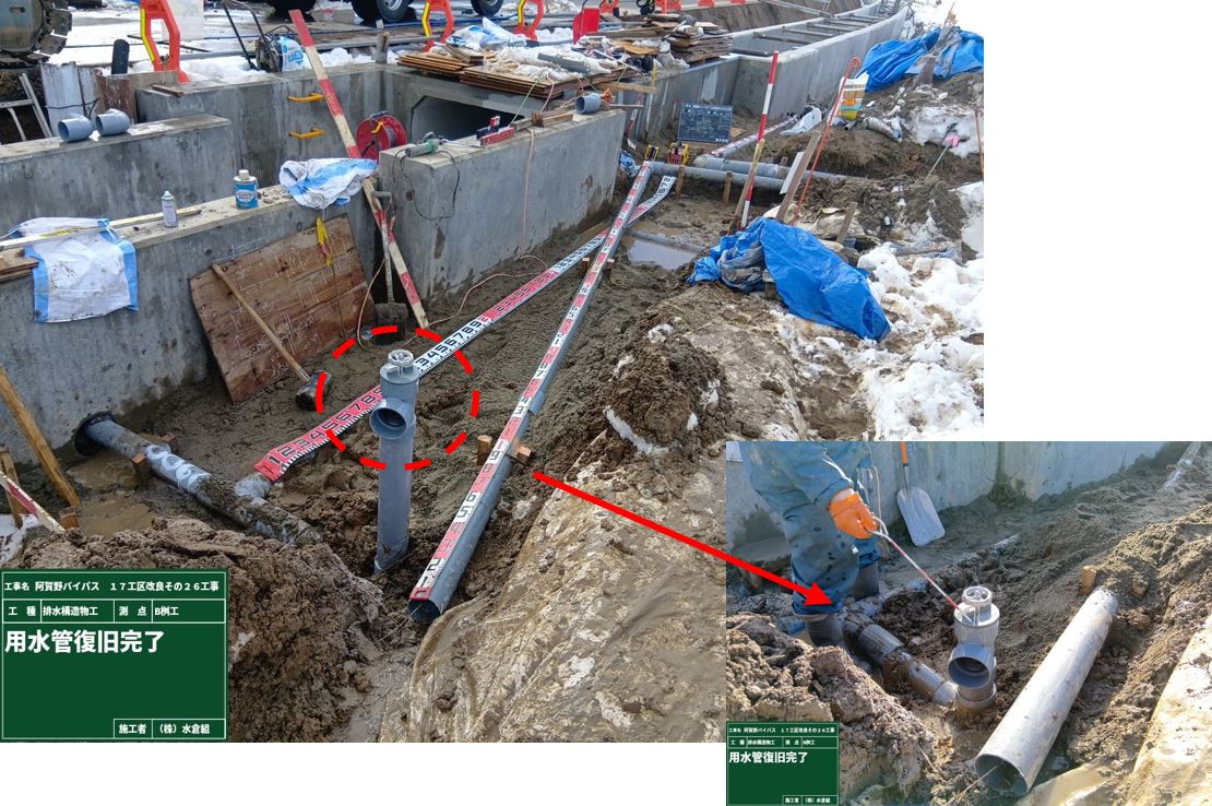 ○新しい水路と旧水路の接続。工場製作品で仮水路を接続して水を流せるようにします。