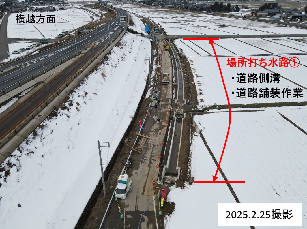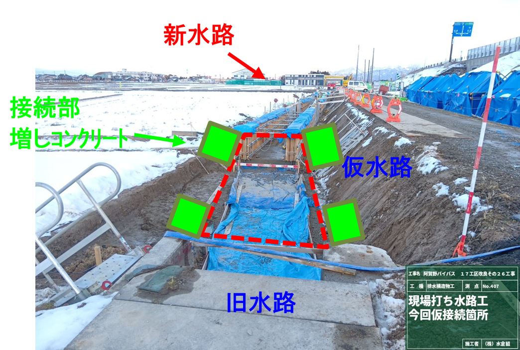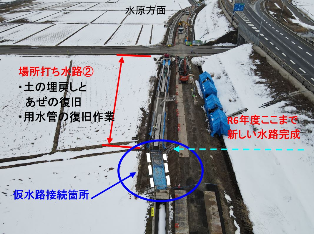新しい水路170メートルを3月上旬で完了。➀で道路側溝と舗装作業、②で水路脇の土埋め作業と[仮水路接続箇所]で新しい水路と現在の水路を工場製作品で接続して、用水を流せるようにします。