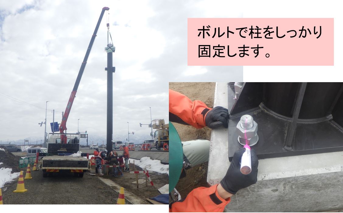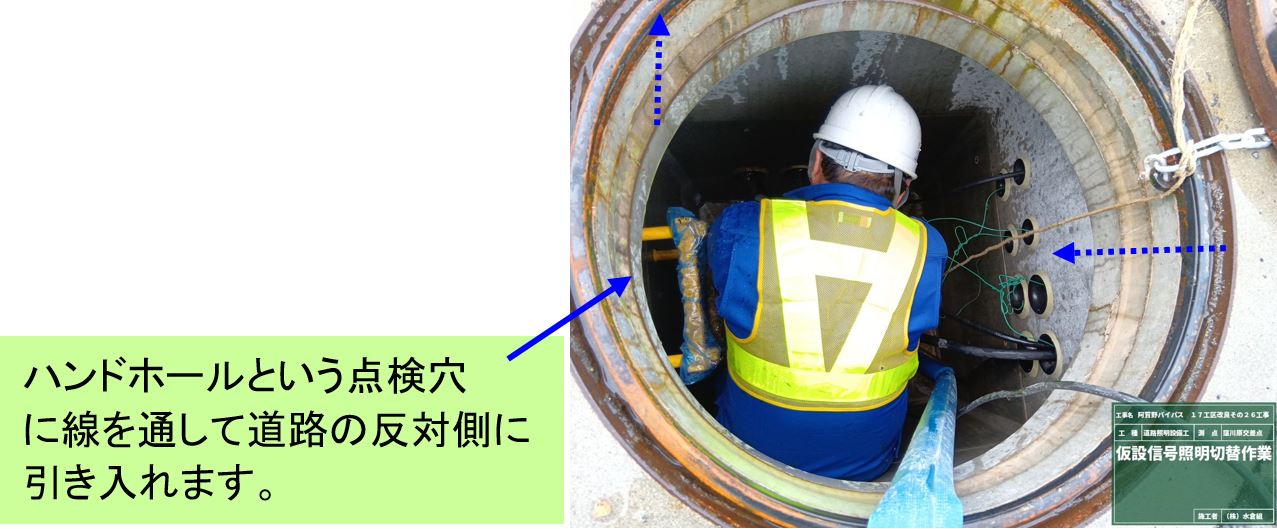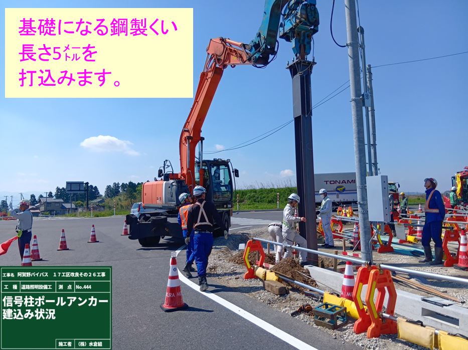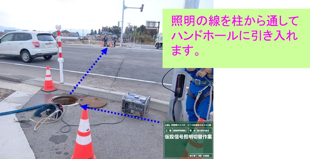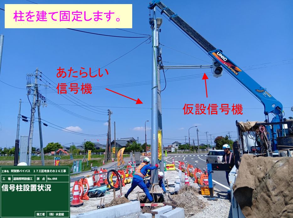 ○道路が広がるので今の信号を移動させるため、仮設の信号と照明柱を設置します。
