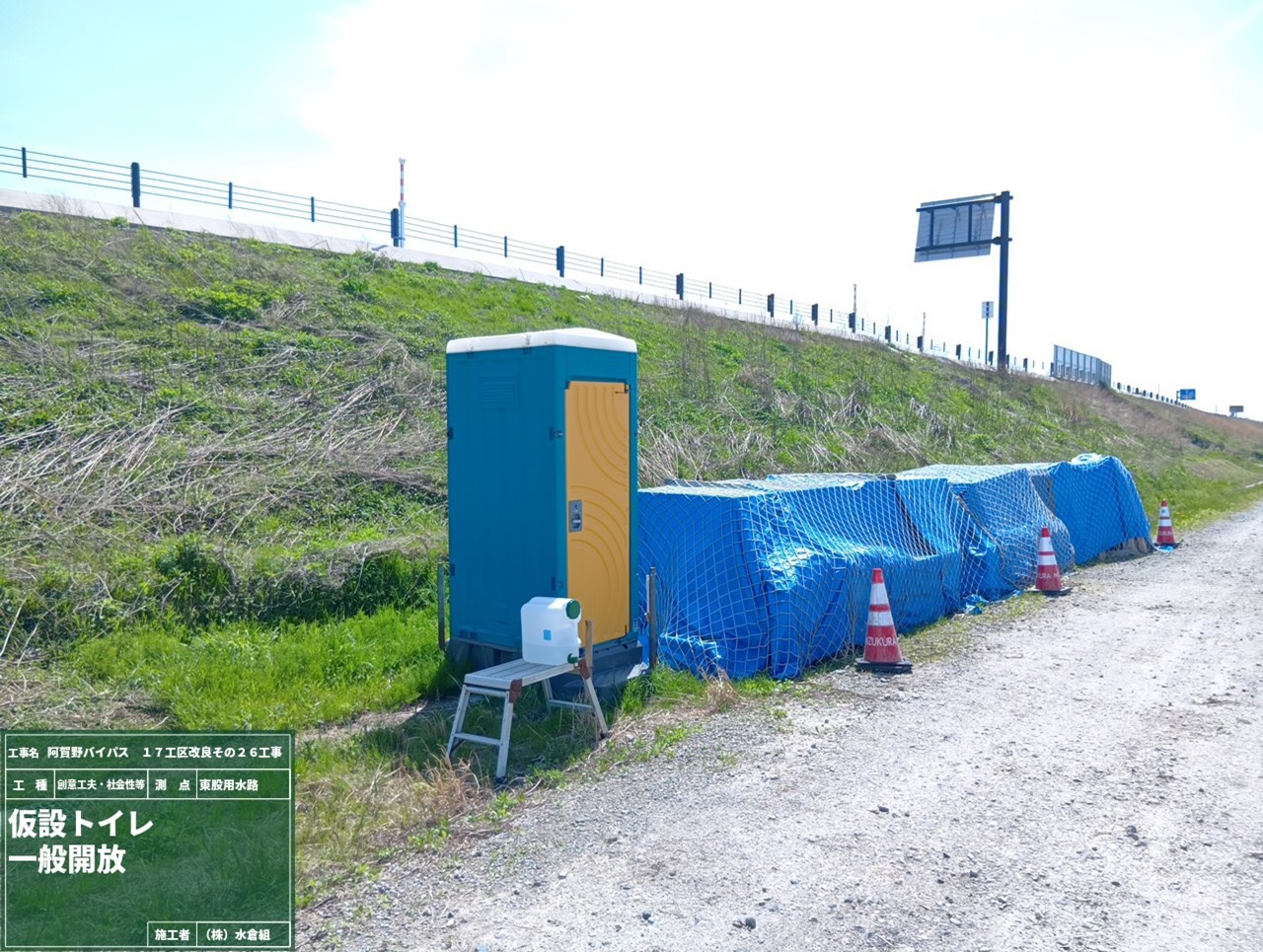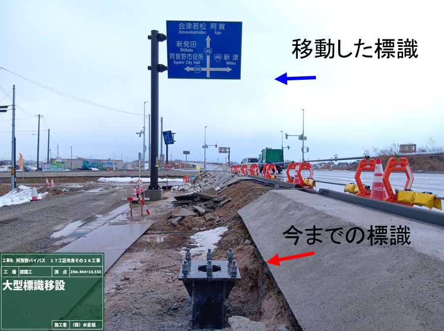 ○国道の路側にバリケードを設置。大型標識をあたらしい位置に移動しました。