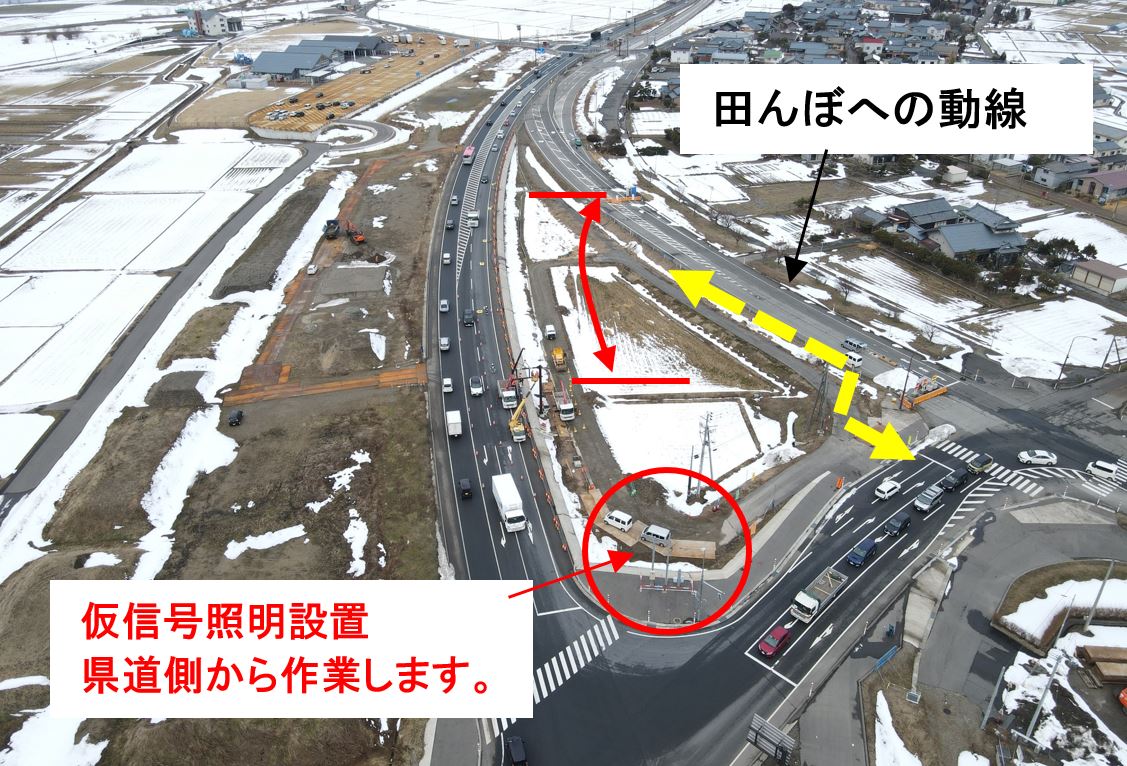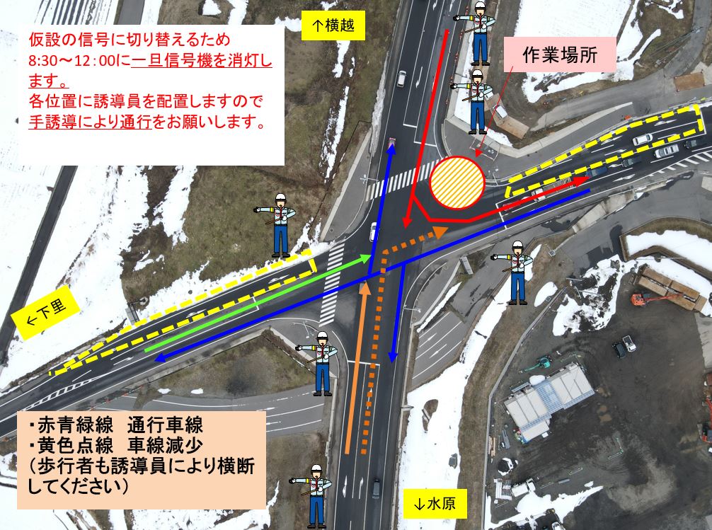 ☐3月18日~26日のうち2日間に仮信号照明工事のため、県道車線減少、信号切り替え時に信号を一旦消灯しますので誘導員の合図で交差点誘導を行います。(各1日ずつ)