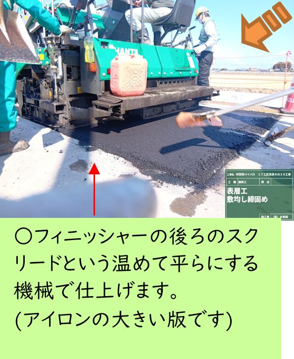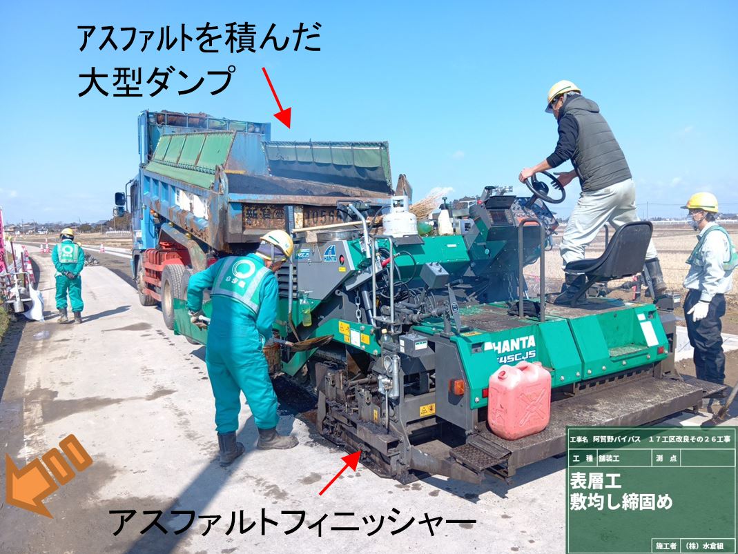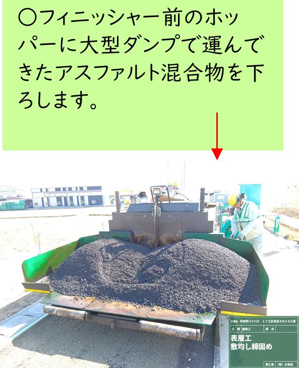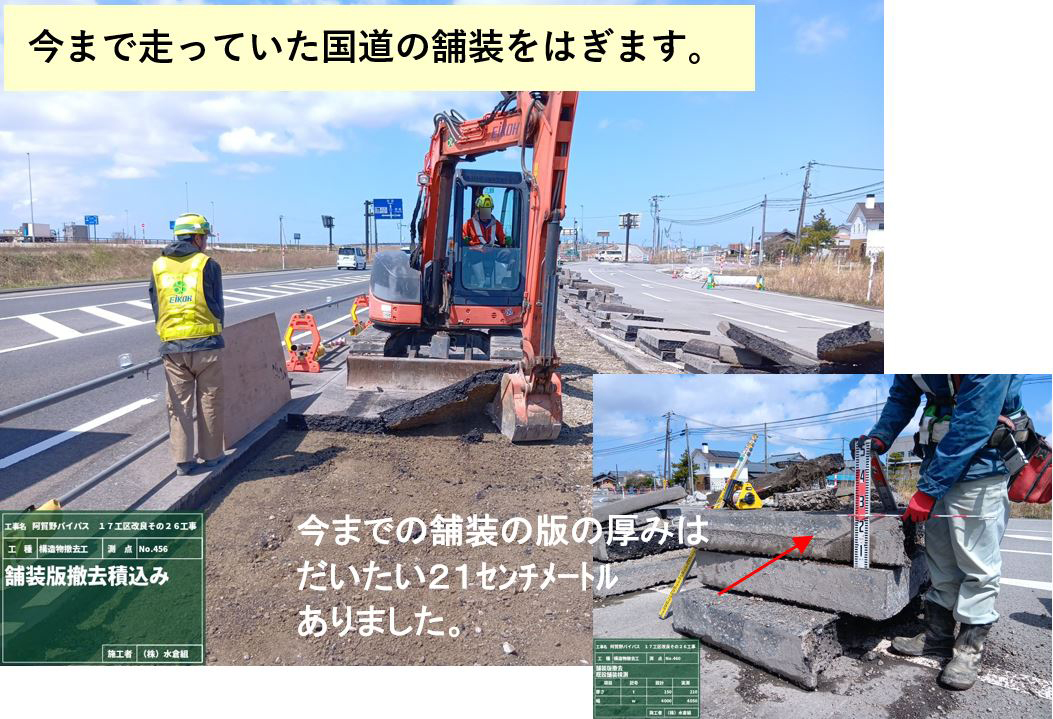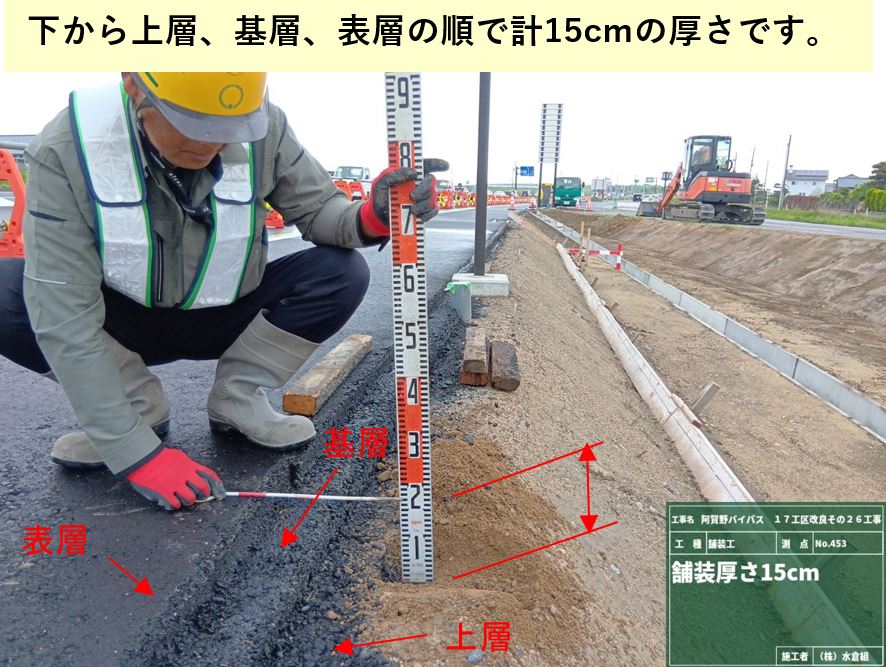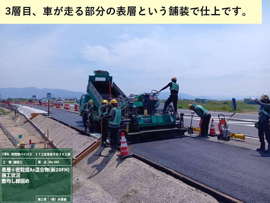 ○国道は厚さ5㎝の舗装を3層に分けて、全部で厚さ15cmの舗装を施工しました。