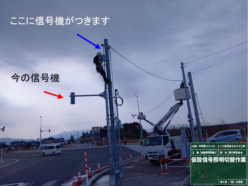 ○信号機をあたらしい位置に移動、仮設の信号を撤去しました。