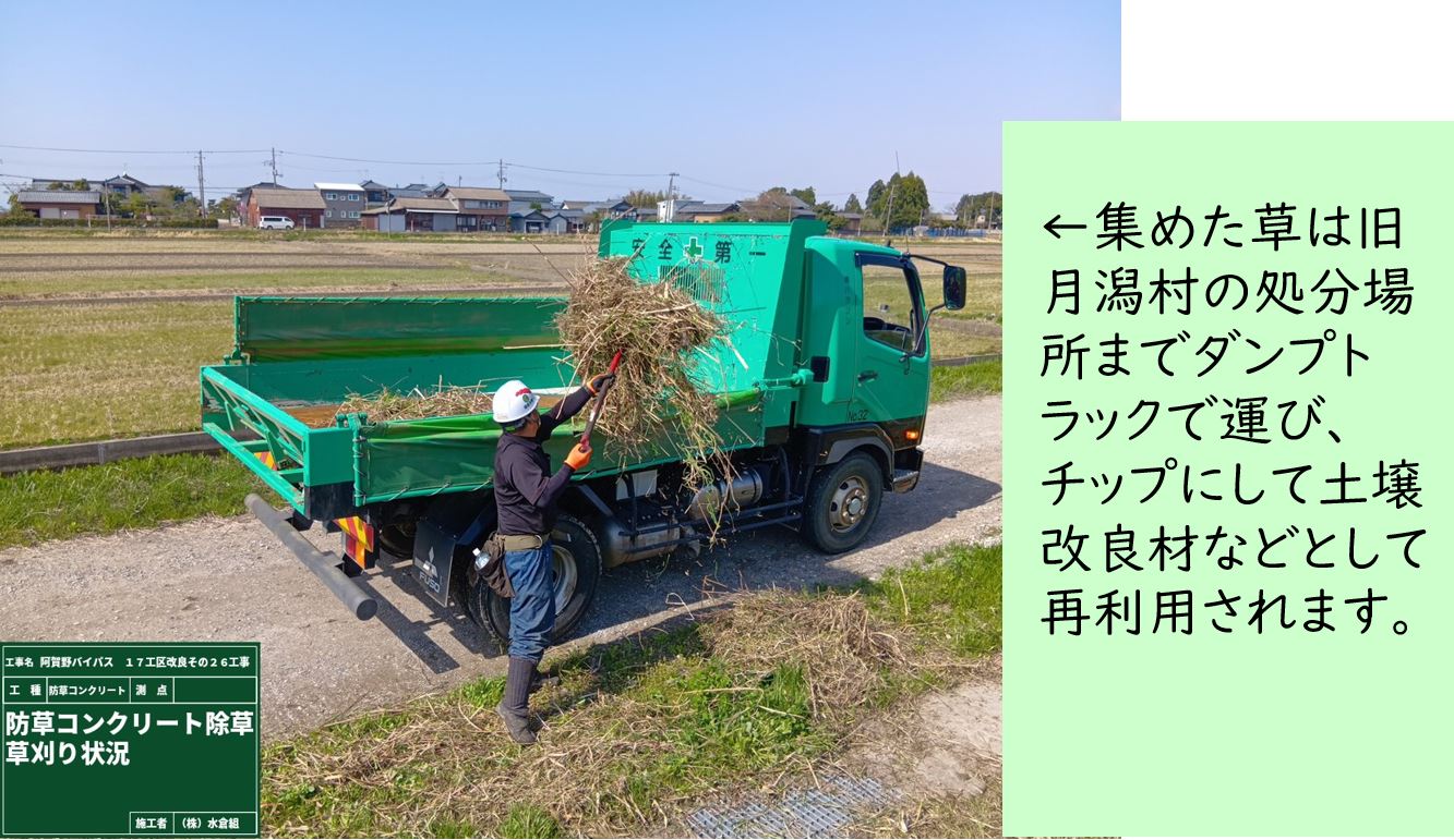 ○防草コンクリートを施工するため草を刈って、集草して処分場所まで運びます。