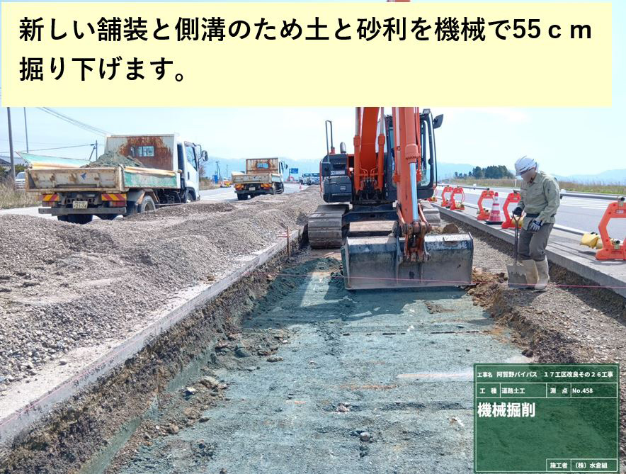○今までの道路舗装をはぎ取って新しい舗装の厚み55cmを掘り、道路排水するための側溝を設置しました。