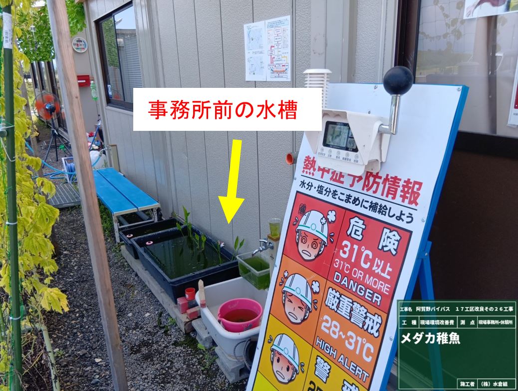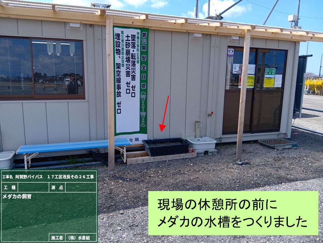 ○あたたかくなって来たので当社の社員が育てているメダカを現場に持って来て、育てはじめました。