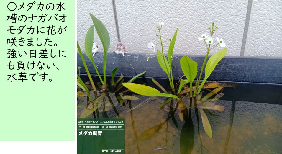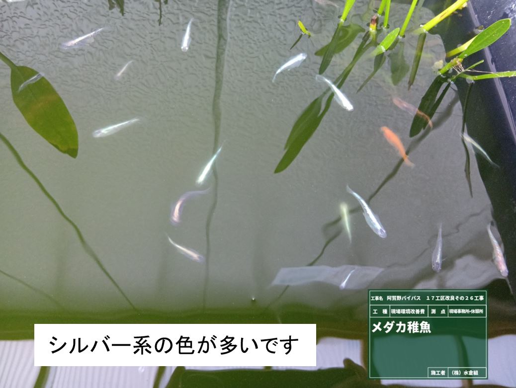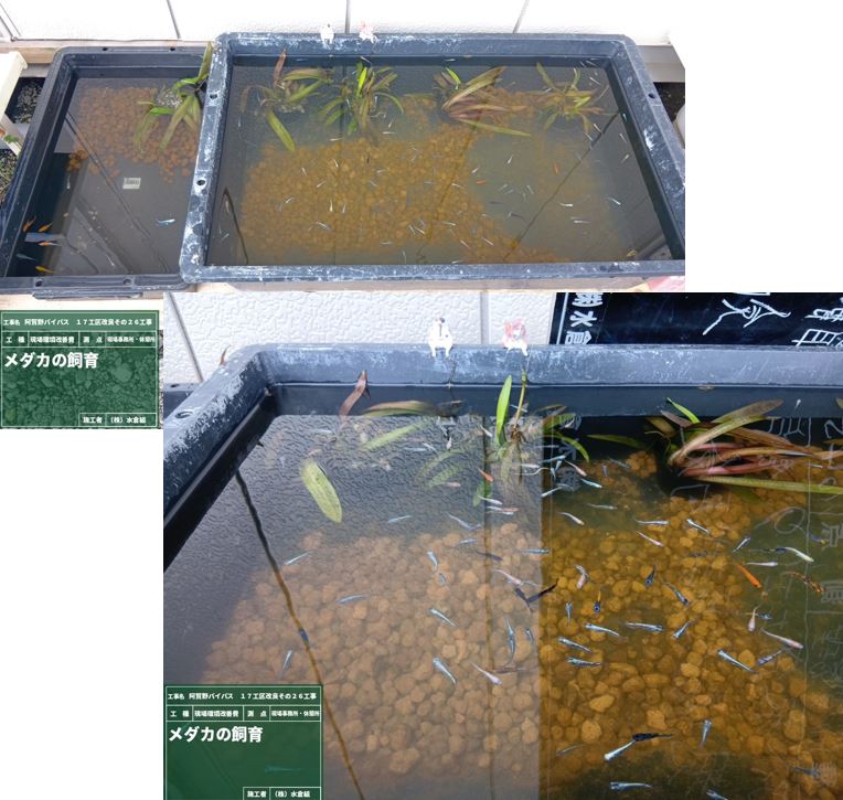 ○現場事務所のメダカの稚魚が好天つづきで大量にふかして大きくなりました。