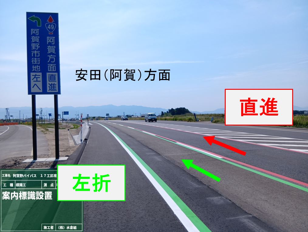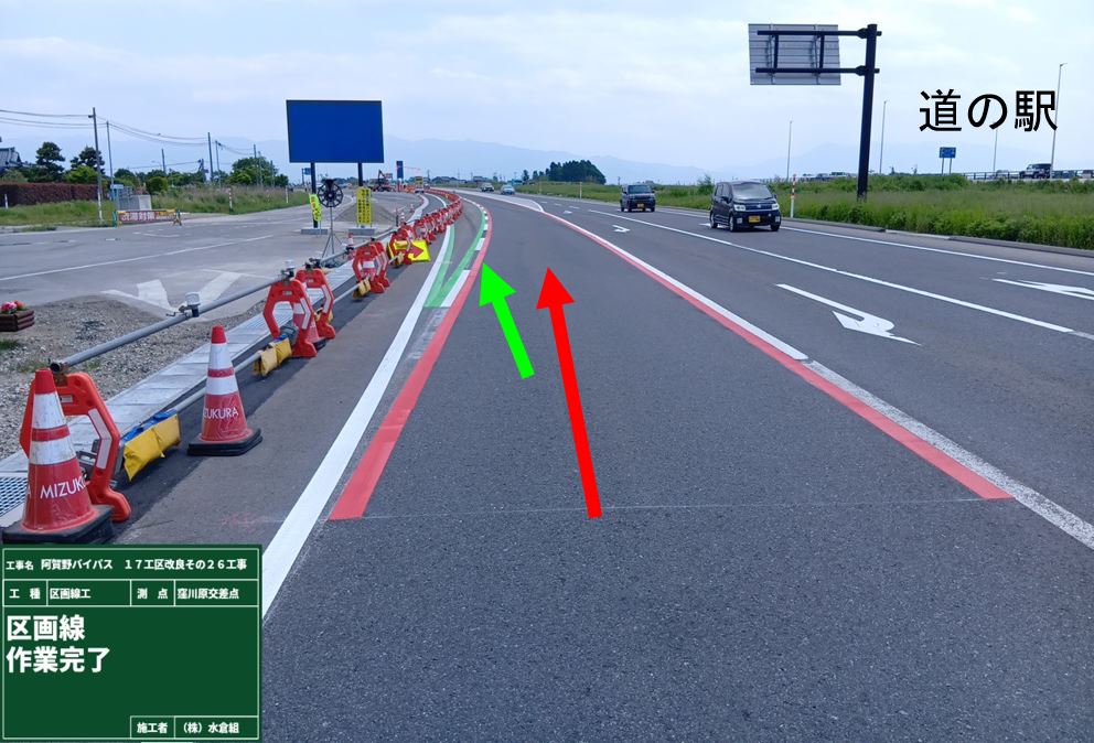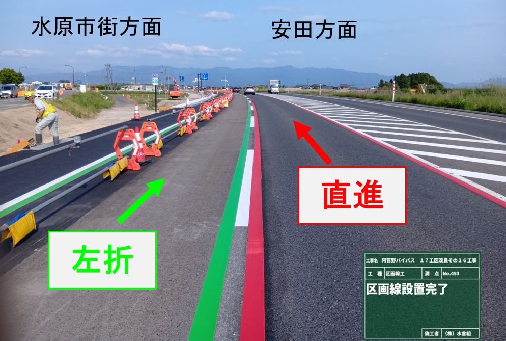6月8日午後から車線が変わります。[あか]直進(バイパス)・[みどり]左折(旧国道49号水原市街)