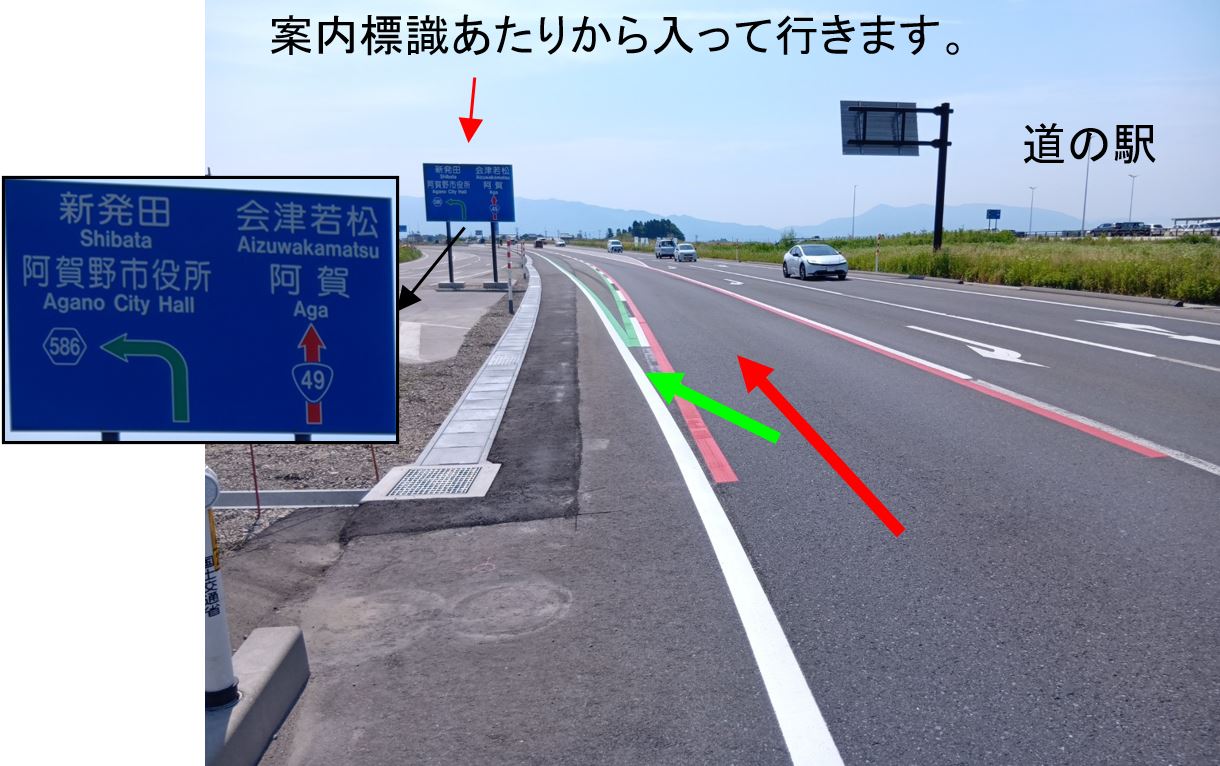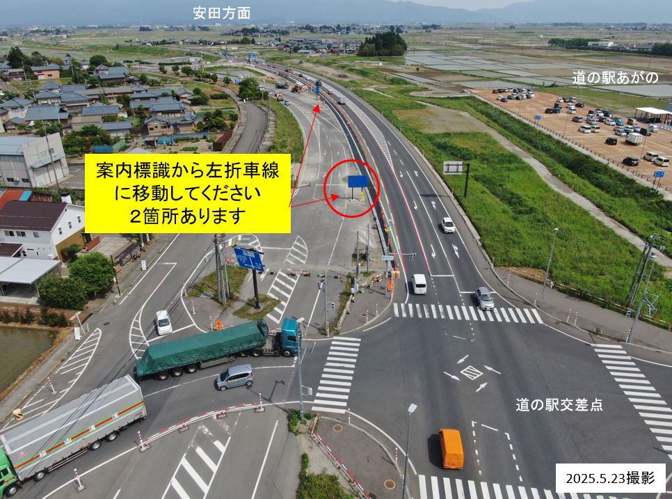 ○道の駅交差点(下黒瀬)から左折車線[旧国道水原市街]へ車線変更になります。