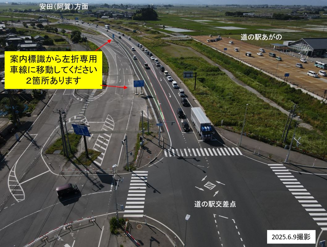 ○道の駅交差点(下黒瀬)から左折専用車線[旧国道水原市街]が増えました。