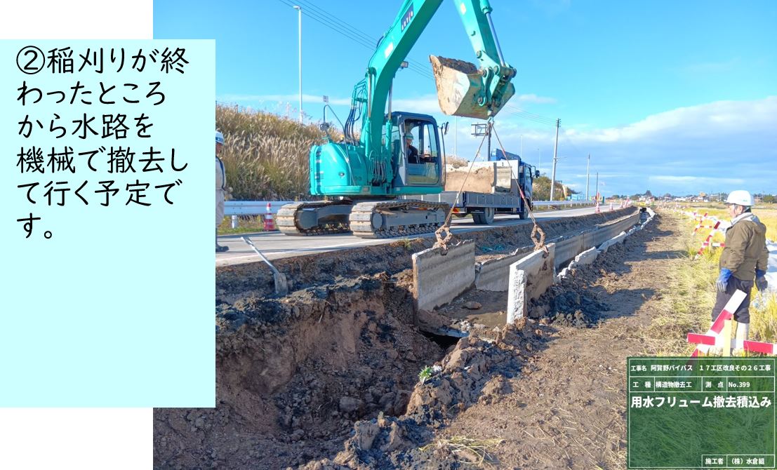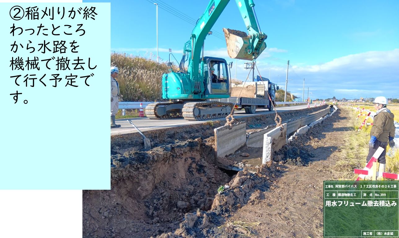 ○稲刈りが終わったところから現在の用水路をとりこわしています。