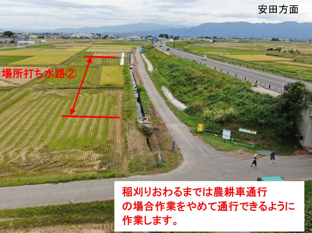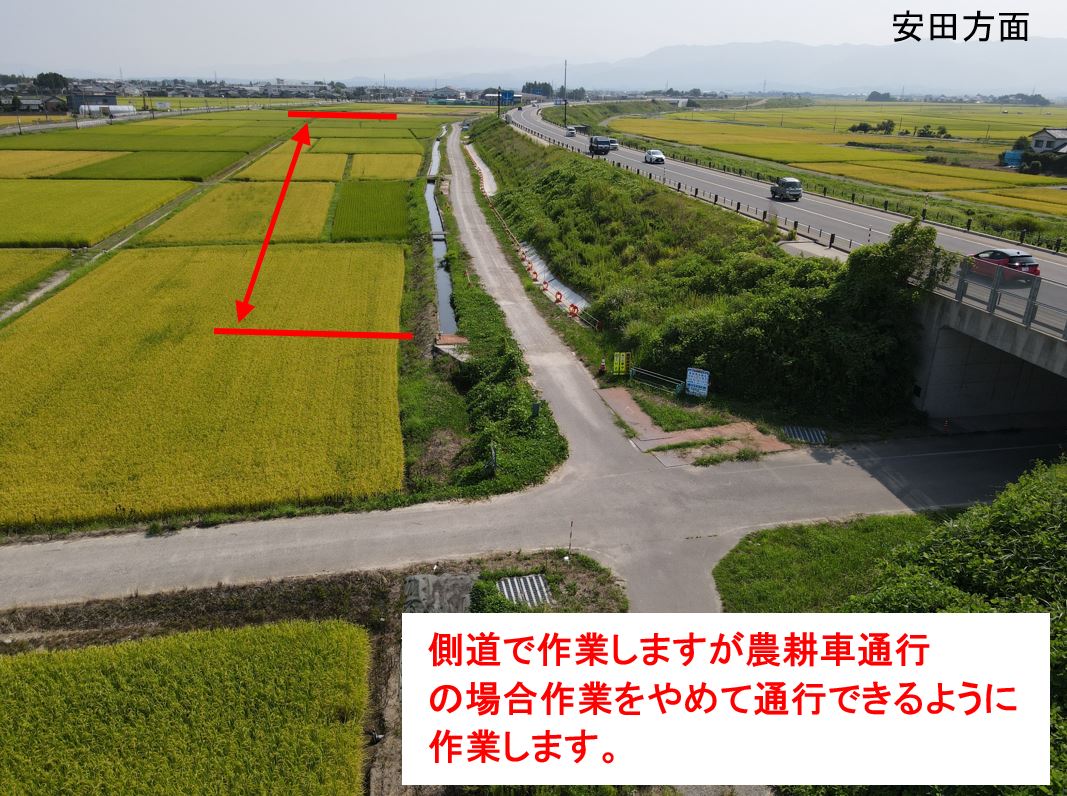 ②側道の通行止めは稲刈り後に予定しています。
