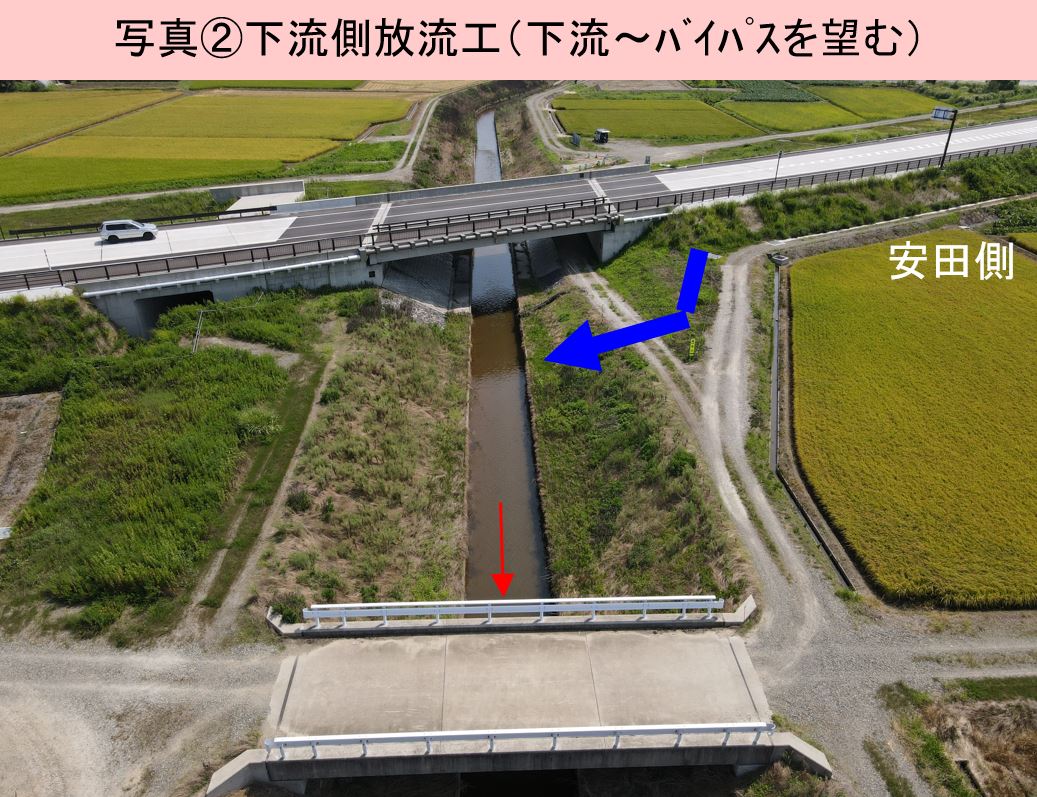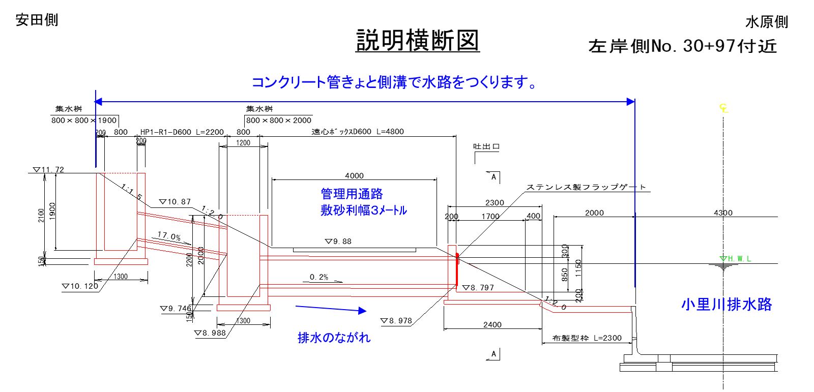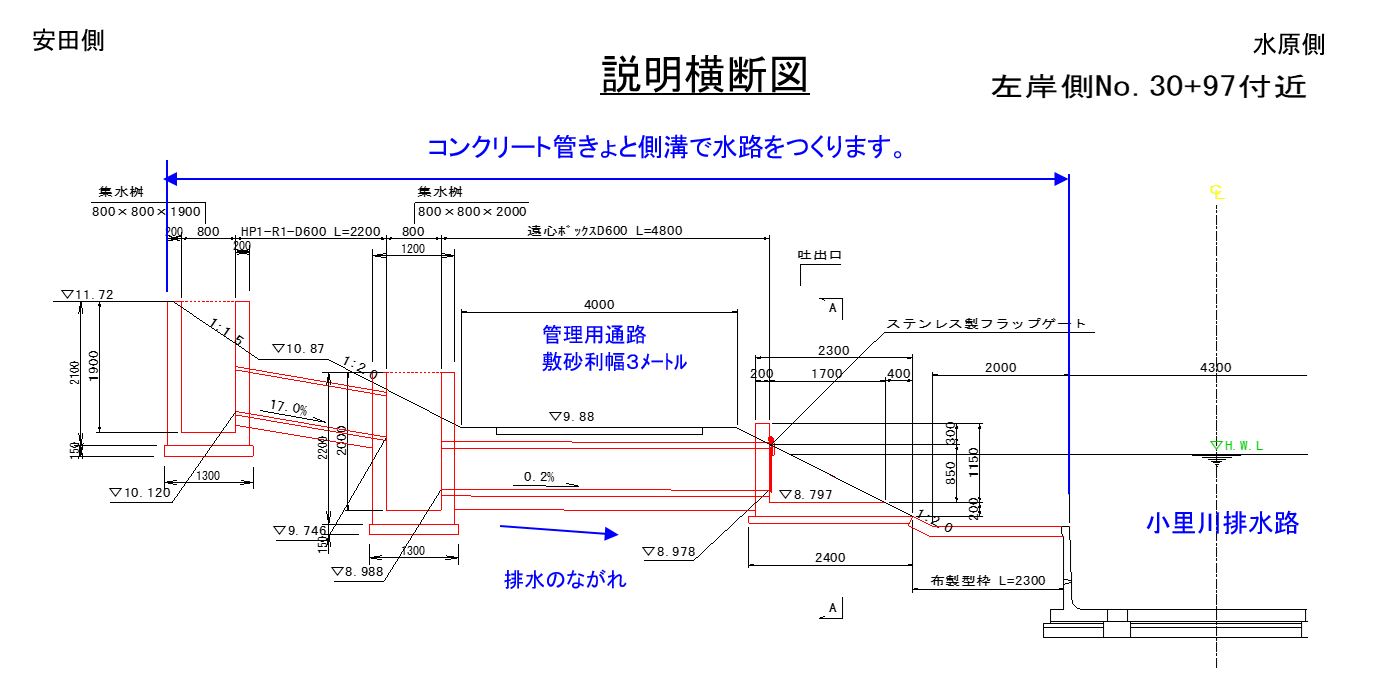 ○小里川排水路の上下流側で放流工をつくります。
